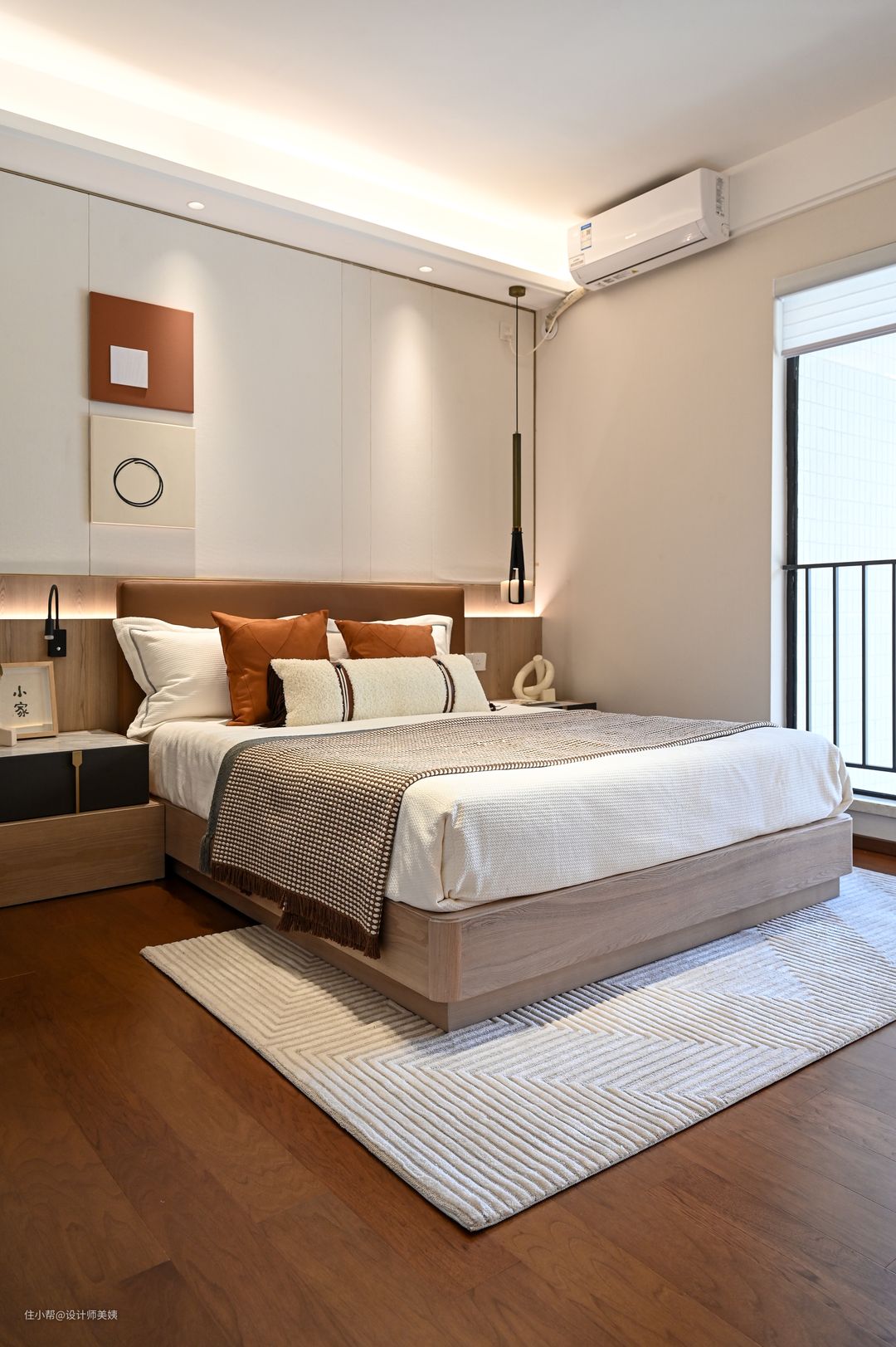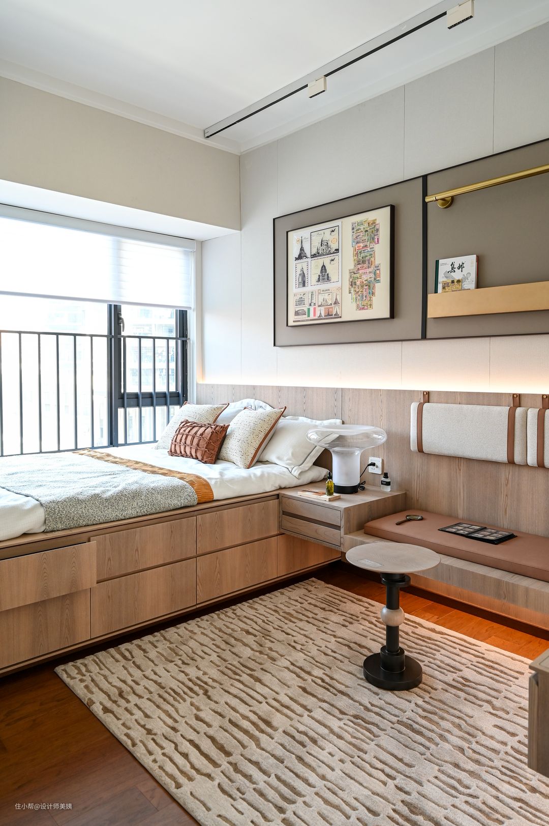 被主卧的背景墙治愈到了,白色床头板下方内嵌灯带,下半墙拼接原木色,一眼望去的高级感。 主卧整体色彩是原木色搭配白色,再加上遮光千叶帘就很适合休息,其他的布置可以简单一些,但是对屋主来说床真的很重要,毕竟卧室里待得最久的就是床上啦!于是换上这款夏木实木床。 在色调这件事上,屋主家真的很统一,主卧放置柔软的双人床,配合上木质妆台简单自在 拉开纱窗,照射的光线也很充足,虽然空间小朴实无华,但是简洁干净。