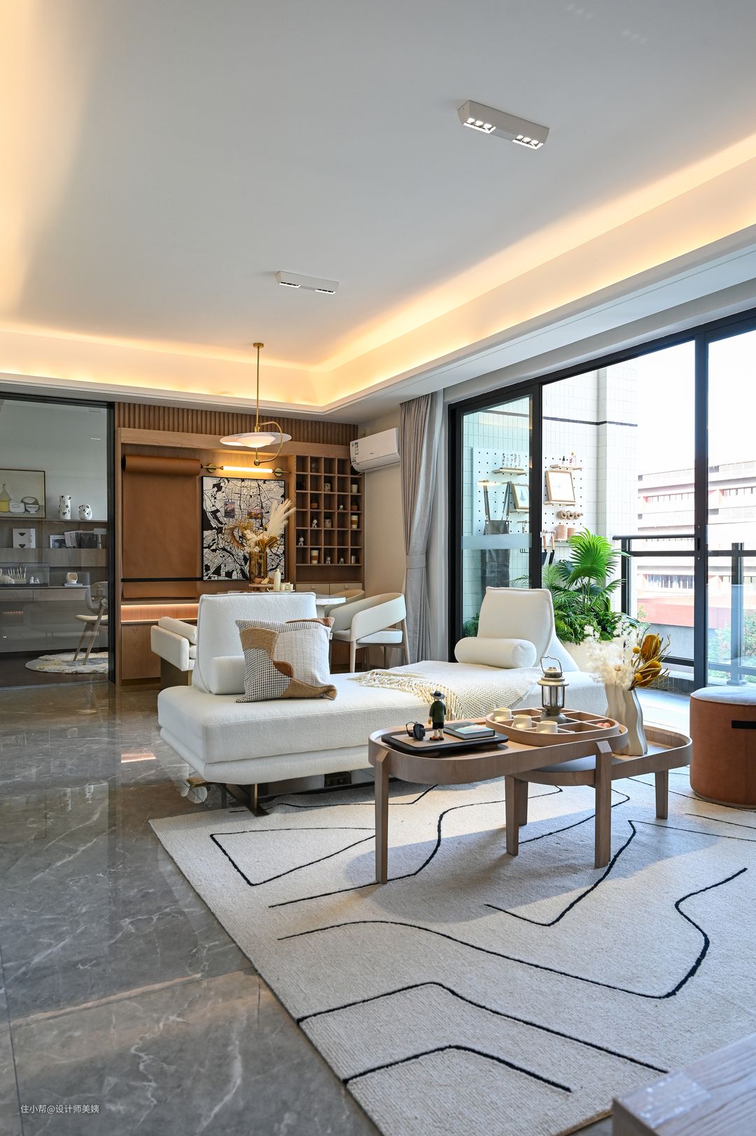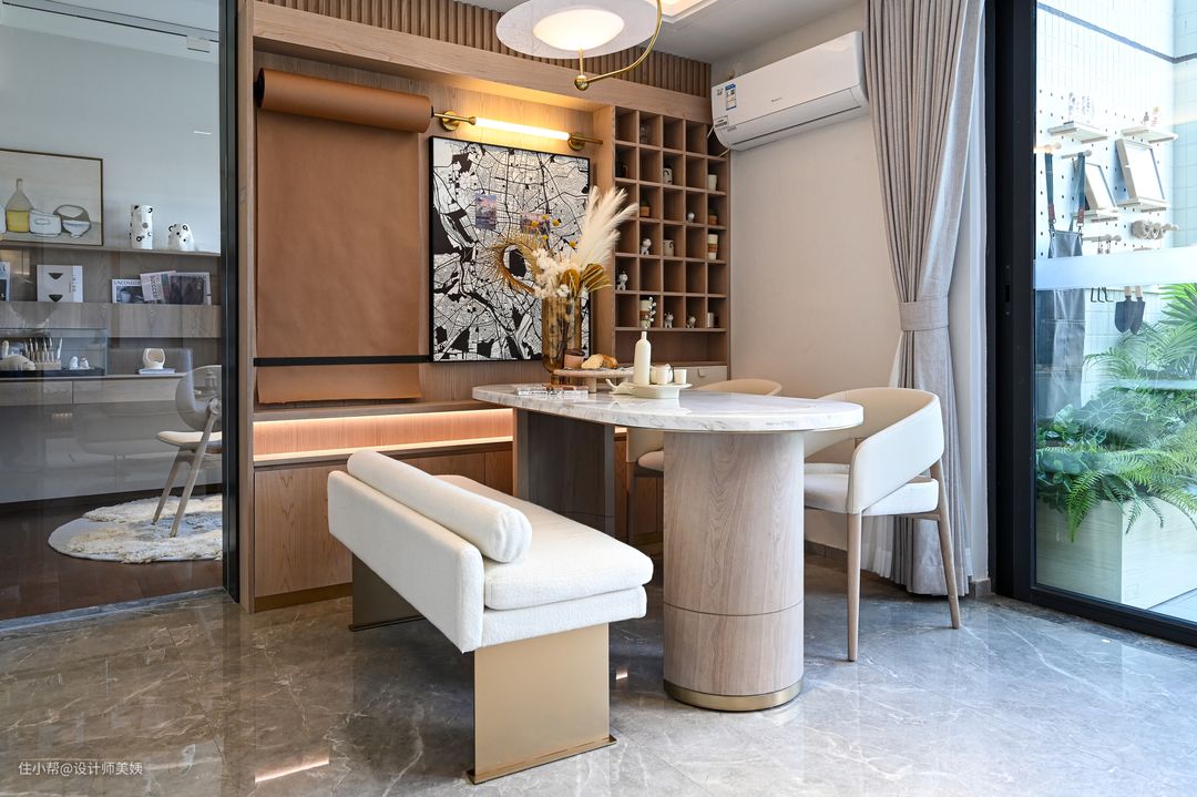 本案注重光线的运用,我们将客餐厅与书房空间合而不并,打造超长动区空间,揉合空间中视觉、空气、光等元素,用天然材料,用清晰的几何轮廓改变和丰富空间,营造一种氛围,达到超凡脱俗的艺术美感。令居住者体验通彻透辟的空间感受。 客厅无主灯(深杯防眩射灯+线型灯+落地灯),深杯防眩射灯预算足够的话,建议选择防眩射灯,见光不见灯,对于层高比较低或者家中有小孩老人的都很友好。 简约风格要求严格,追求完美的比例感。你们会发现这里没有过多的装饰,空间中的每一个元素都需要经过慎重选择和思考,从而创造出宁静舒适的整体感受。