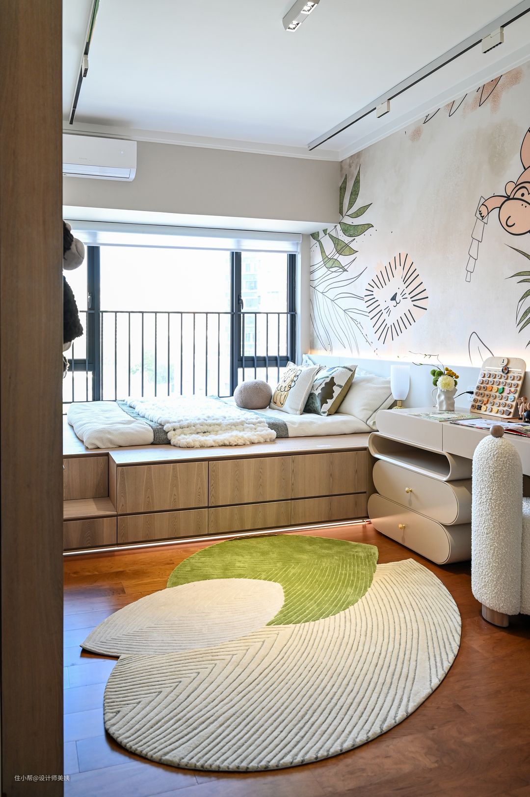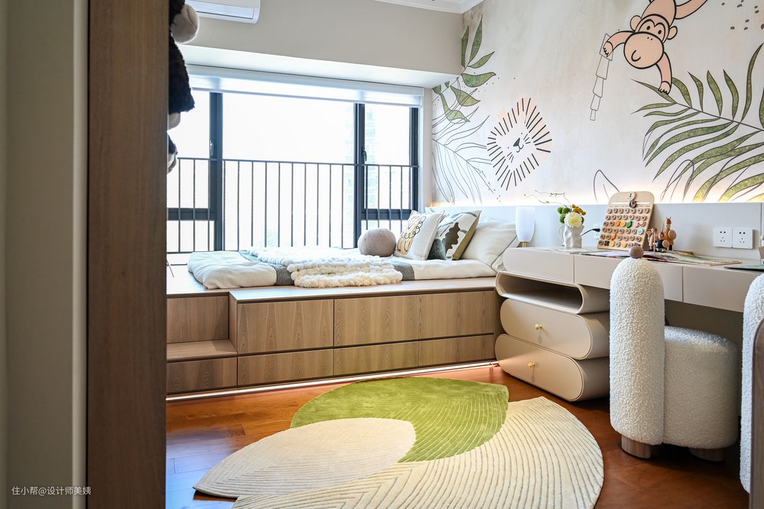 小卧室也能变“宽敞”?那是因为用了榻榻米呀!奶油的配色,搭配上原木色板材。简约原木风的基调,柜体选用奶油风,再结合上原木色,怎么都不会出错的啦~ 利用开间,造个地台床,侧面抽屉收纳,床尾刚好留空,做了层台阶,不会显得很逼仄,还能放一些喜爱的玩偶~ 硬装选择简简单单的是纯白色的设计,根据宝宝的年龄选择不同的软装搭配,台灯、壁纸、摆件、地毯等等都可以轻松切换 ~