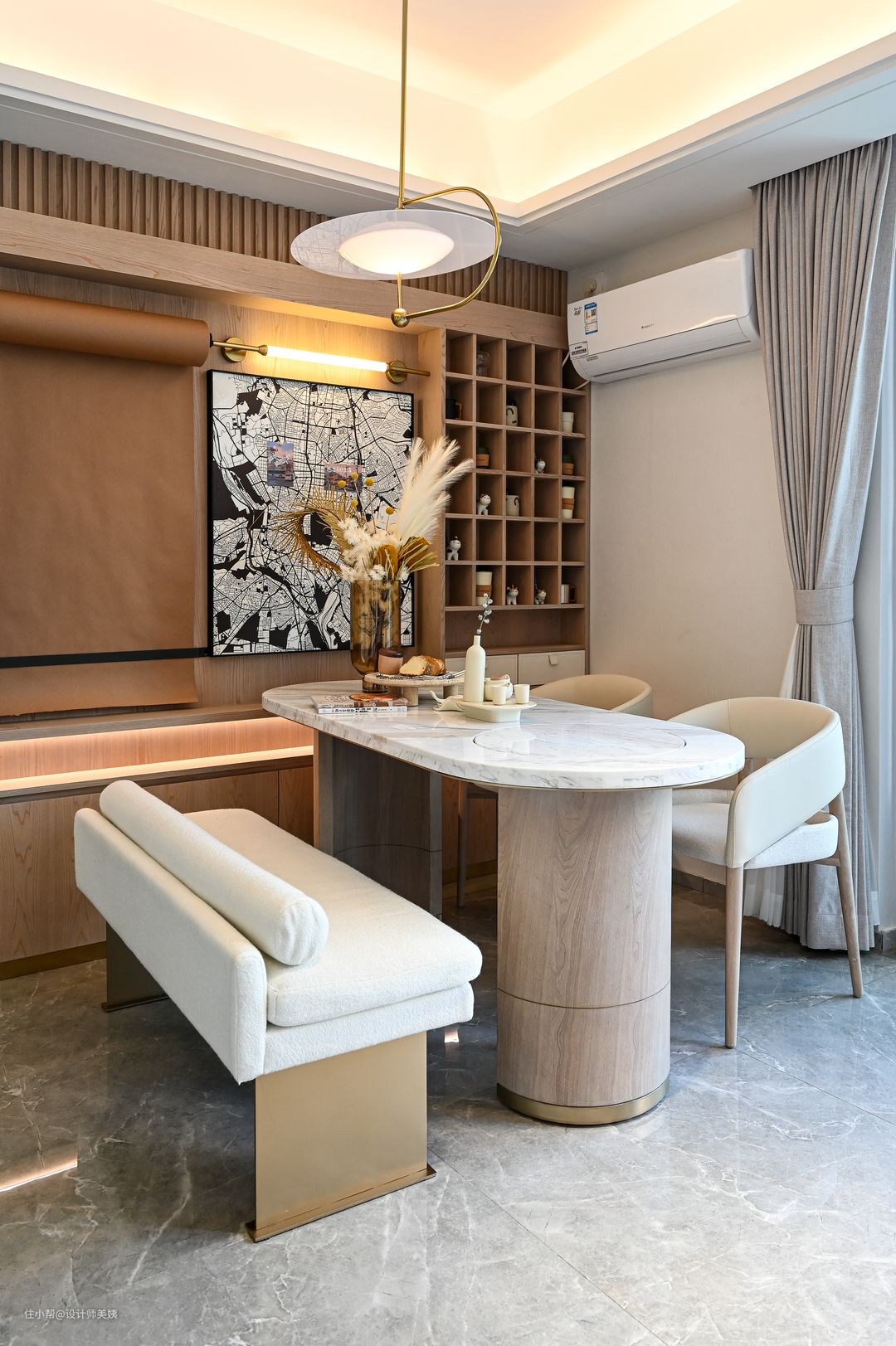 比较简约的奶油色餐厅,小巧却很大气,奶油色为主基调,搭配与原木色成为视觉焦点,餐桌上方的吊灯,桌椅的脚,适当融入的金属元素尽显精致氛围。 将次卧隔墙拆除后做一面餐边柜,将杂物收纳于隐形,还居者一片整洁与清爽。而原木色彩呈现出舒适柔和的状态,餐边柜与灰色窗帘丰富了空间的色彩层次。