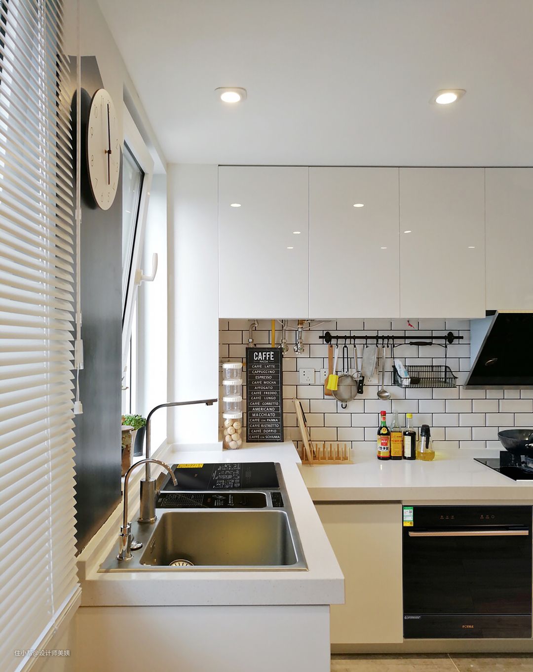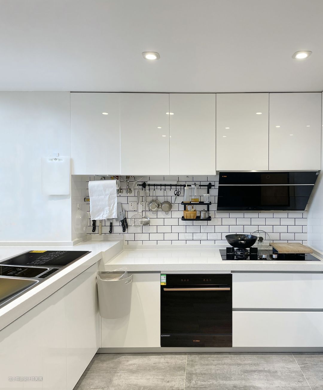 整个厨房都是白色系,白色柜门、白色台面、白色墙砖,简约大气。 其中的设计秘诀分享给大家: ➡柜门无拉手设计,采用45度斜角,用的实木烤漆哑光白色,搭配白色柔光砖,空间更显大。 ➡灰色通铺,耐脏好清洁,偶尔偷懒下也看不出来。 ➡舍弃集成吊顶,用埃特板吊顶,统一简洁美观。 ➡延续客厅无主灯设计,统一用的3500k色温的射灯,光线足够。 ➡厨电都做嵌入式,更节省空间。 屋主做白色厨房被很多人无情的嫌弃:不好打理、不耐脏,但入住三个月了,厨房还是干干净净!无油无烟的厨房秘籍就是选择了方太油烟机。这款油烟机超大风量,还有一键瞬吸功能,因为爆炒的时候油烟都是一瞬间就升腾起来的,它能在一瞬间让油烟无处可逃!还有一个很贴心的功能,手上有水、油或面粉的时候可以直接挥手开启或关闭抽油烟机,不会弄脏面板。搭配的方太5kW大火力燃气灶,热效率65%,轻松满足爆炒需要的大火力。黑晶玻璃面板不易沾油,一擦即净,五重防爆玻璃,安全方面也更加不用担心。 屋主母亲快七十了,屋主周末在家时会竭尽所能帮母亲一起做家务,所以凡是能解放双手,减轻家务负担的产品,屋主都会让我在设计水电前预留好位置,就比如厨房的嵌入式洗碗机和水槽洗碗机。 厨房操作台高度是根据家庭成员的平均身高而设计的,而这个厨房的操作台高度最多只能嵌入60.5厘米高的洗碗机,方太嵌入式洗碗机G1尺寸刚刚好,虽然是常规8套洗碗机的尺寸,但是碗篮设计非常优秀,拥有11套的容量,碗筷到锅盆一次性洗完。方太洗碗机采用的是高能气泡洗技术,给水流中注入空化气泡,比一般洗碗机冲刷力度更强劲。而且可以把小残渣自动排出,无余水无异味,还能定时热风透气,可以安心存放7天,直接省下买消毒柜的钱。 虽然嵌入式洗碗机真的为屋主节省了很多时间,但工作日屋主不在家时,屋主的母亲在之后日常中使用嵌入式洗碗机慢慢觉得要弯腰放这么多的碗筷太累了。为了满足平时只有老人孩子的少量碗筷,还不用弯腰,屋主后来根据我的推荐,将原本的单水槽换成了方太水槽洗碗机ET03,将水槽+9套容量的洗碗机+果蔬净化机三合一。除了不用再弯腰洗碗,还可以清洗果蔬海鲜等,解决了果蔬农残问题。