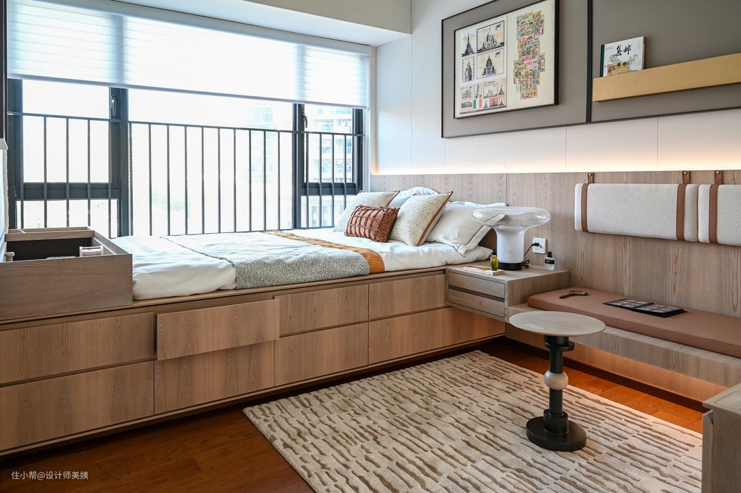 传统榻榻米?拜拜了您嘞,收纳&地台床&阅读区一体。抬高50公分做地台床,抽屉收纳+两层台阶,床尾空间有效利用~ 整个榻榻米采用现代简约设计,全屋大面积使用克诺斯邦色系的原木色板,木色具有生命力,是做榻榻米的不错选择~