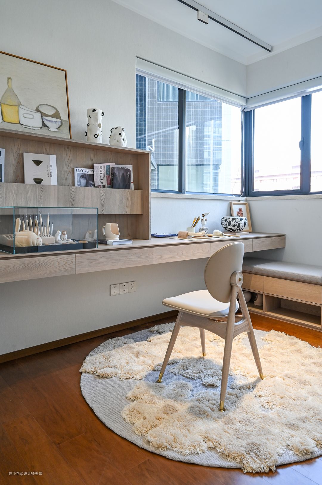 淡雅、清新环境简直不要太治愈,书房以奶白色调搭配原木定制家具,营造出治愈温暖的氛围。2.6米的超长书桌,上方是开放式书架和吊柜,可以放很多本书。原木色的柜体是烤漆材质,触感很舒适,书桌下方打了钢架,不用担心变形。 通铺的木地板搭配落地玻璃门设计,不仅让书房与其它区域更具整体性,也让房间显得更加宽敞通透。