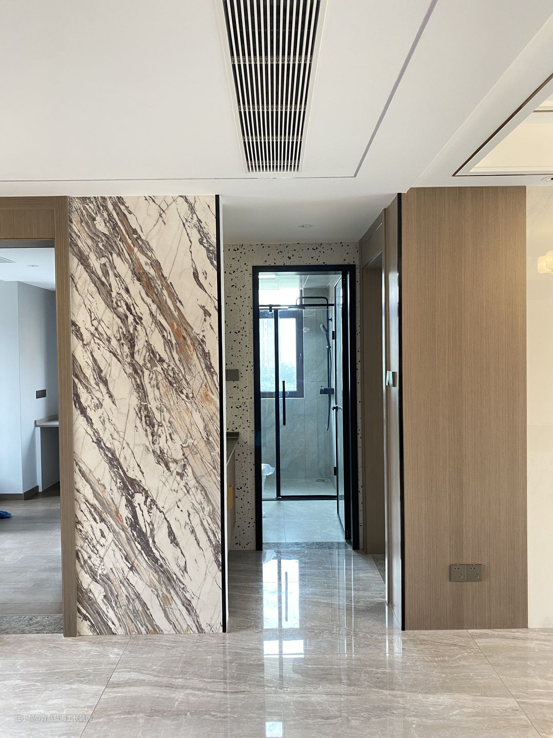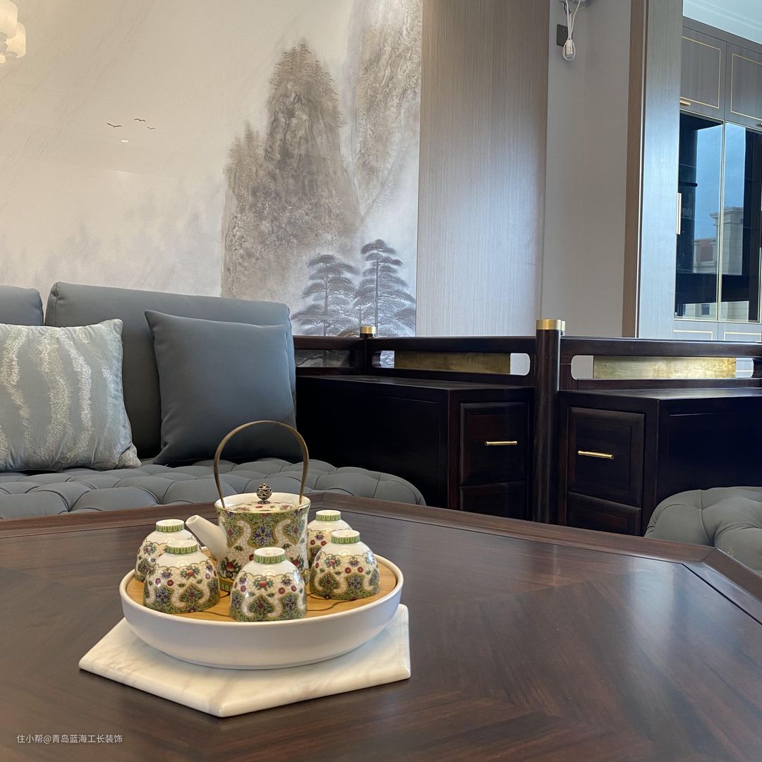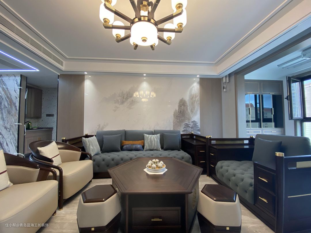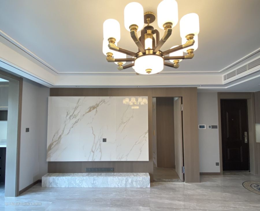 客厅之前有一个门洞,经过蓝海工长装饰王雪梅设计师的精心设计,做了一个隐形门的处理,作为了备用卧室,用整体的木饰面覆盖,使整个客厅的墙面看起来非常美观,电视墙设计了一个大理石的包面,同时定制了一个大理石的柜台,能够达到一个比较完整的电视墙的效果。