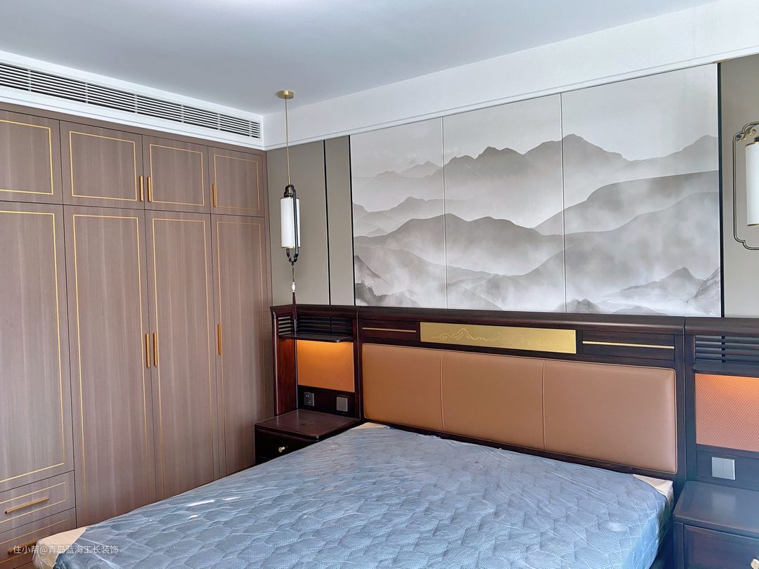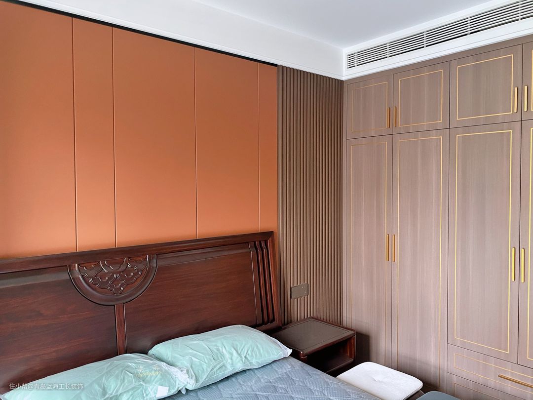 从楼层和光线上来说,是非常舒适的,设计了比较大的飘窗,,对于飘窗,进行了一个包套处理,使整个飘窗和木饰面还有柜体的颜色融合进去,床头背景选用了暖咖色系,与木质的颜色形成一个非常好的衬托和包容。