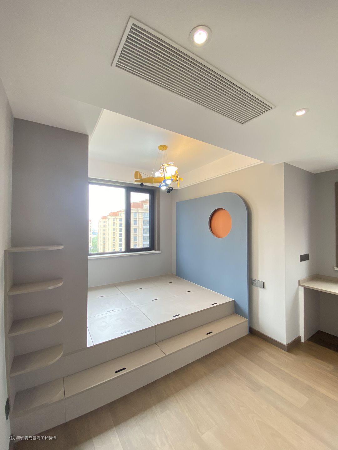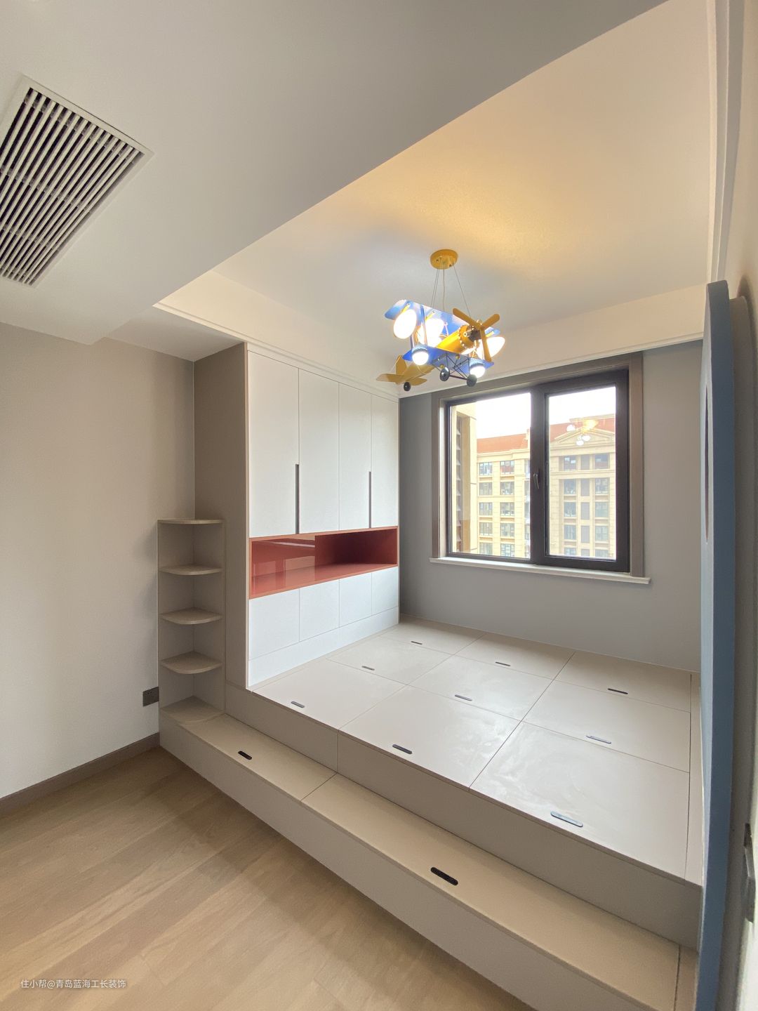 次卧作为备用卧室,考虑到会有一些亲戚、老人过来住,整体的格调采用了新中式的配色,同时考虑到次卧空间没有很大,可以在小空间里运用跳色,所以背景色选用了亮一点的颜色搭配,使这个空间更加活泼。 儿童房设计的比较有童心,添加了比较活泼的颜色,对卫生间进行了一个大的改造,改成了一个小衣帽柜和书房,做了较多的收纳空间,床则做了一个榻榻米的造型,以及做的一个台阶的设计,都是保留孩子居住的一个乐趣,并且选用了一个飞机灯,也是对于孩子兴趣的保护。
