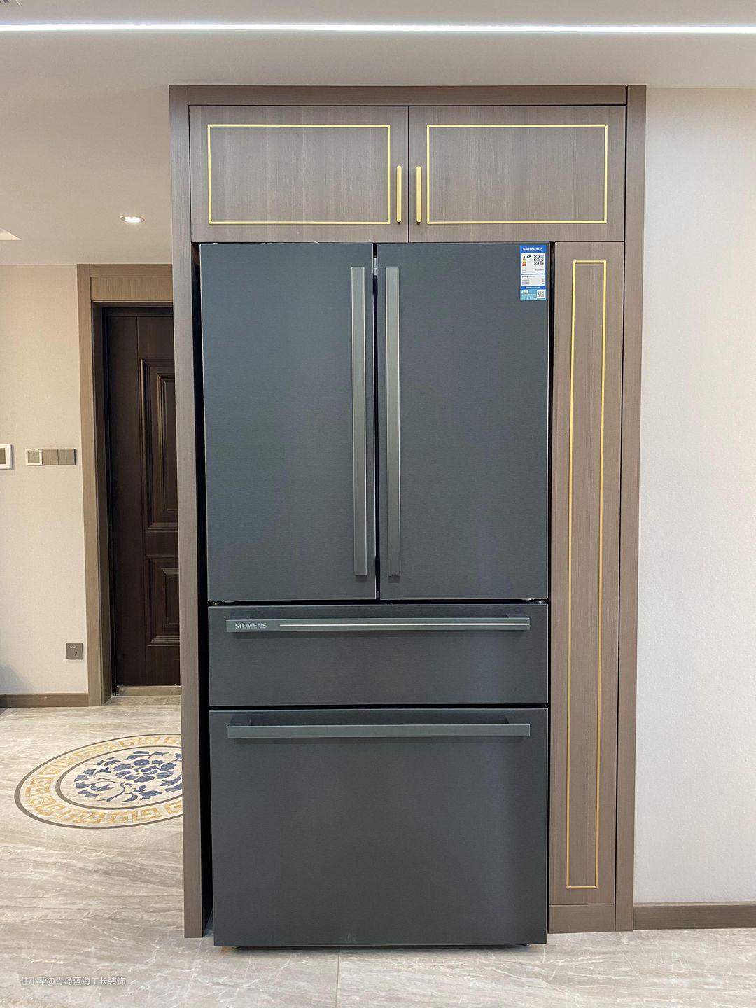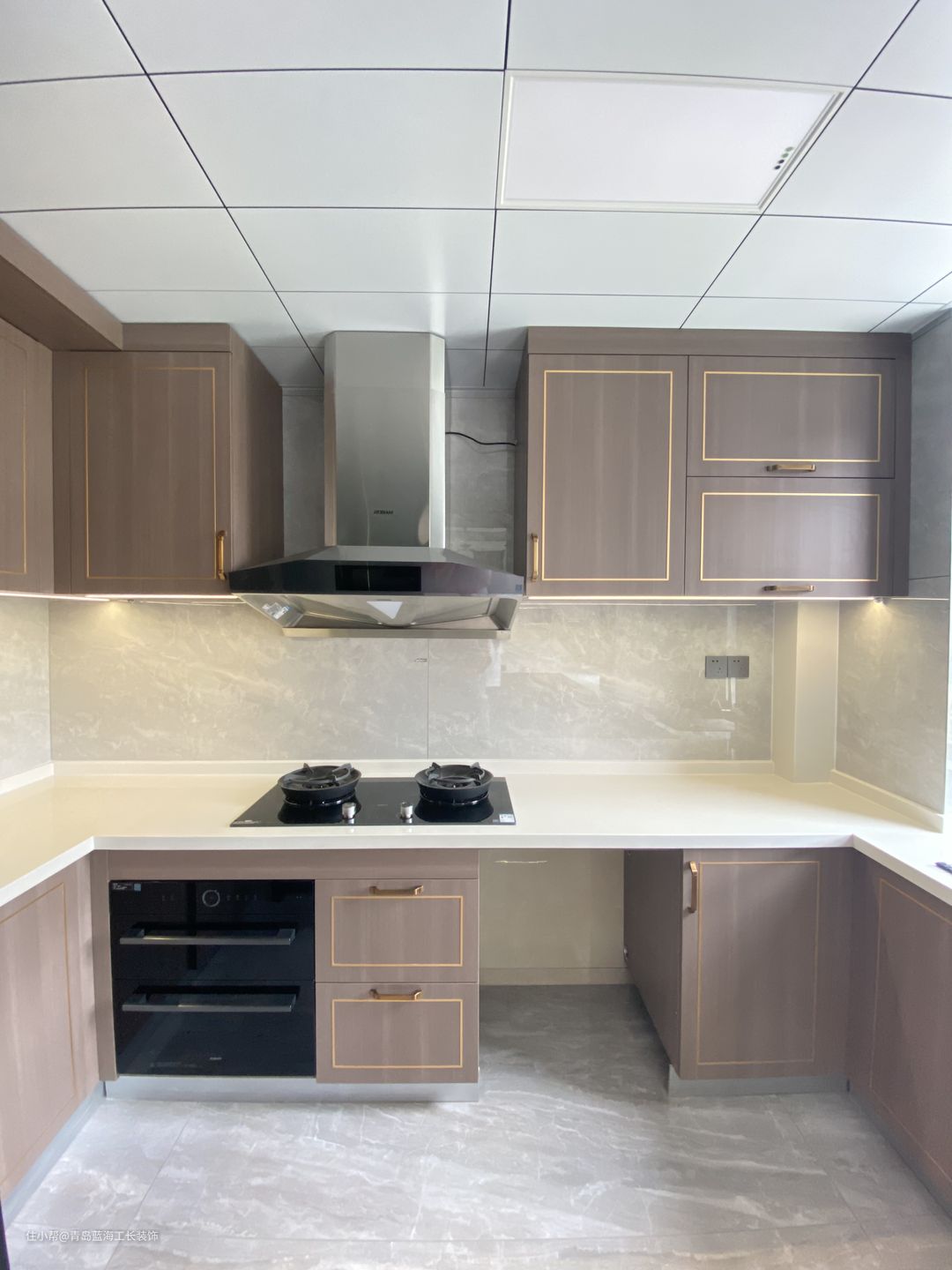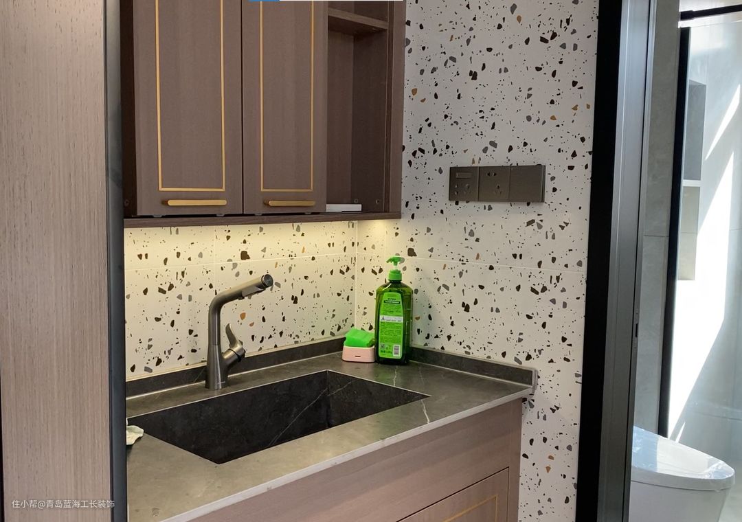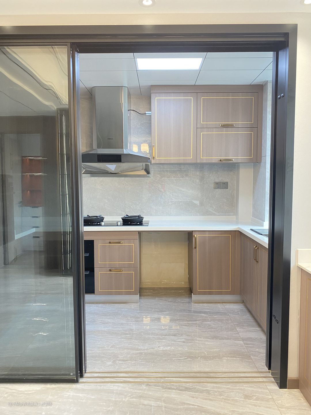 厨房整体是一个U形设计,一进入就会有一个洗菜区,紧挨着是切菜区,并且在切菜区的上方添加了定制柜,柜体下方加了一个感应灯带,方便照明,厨房门用的是隐形地轨,做了三扇拉门,在保证美观的基础上,又能维持它的稳定性。