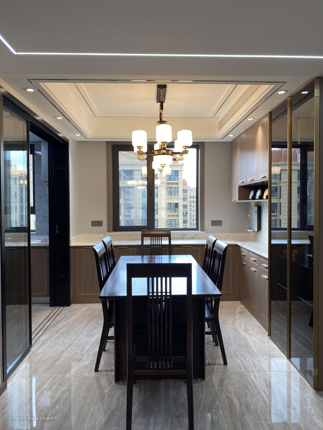 厨房的户型是改过的,原来的厨房门是在进门的一侧,经过王雪梅设计师与业主的讨论,改成了一个厨房与餐厅的关系,上菜也非常方便,另外,餐厅紧挨着一个西餐台,方便操作。