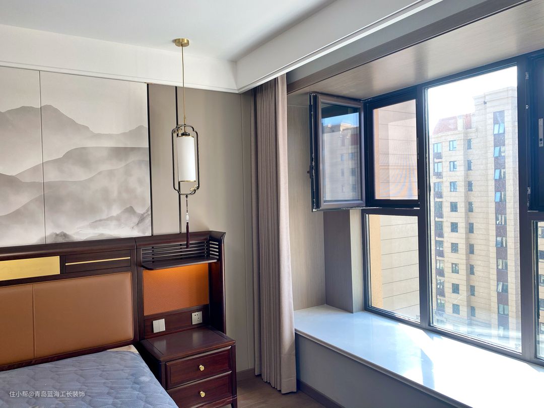从楼层和光线上来说,是非常舒适的,设计了比较大的飘窗,,对于飘窗,进行了一个包套处理,使整个飘窗和木饰面还有柜体的颜色融合进去,床头背景选用了暖咖色系,与木质的颜色形成一个非常好的衬托和包容。