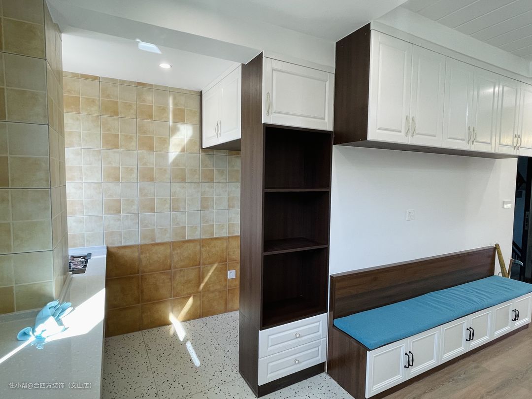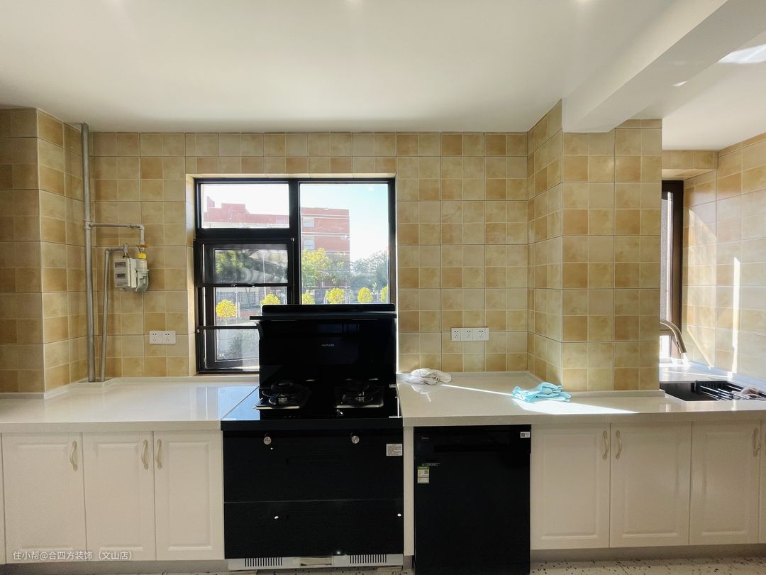 再看将看点放在厨房,方位很正的厨房,采用u型布局,除了保证烹饪流程顺畅以外又增加了两边的一体柜,收纳性极强。右边的地柜还可以当休息区,是一种很新引的设计方式。