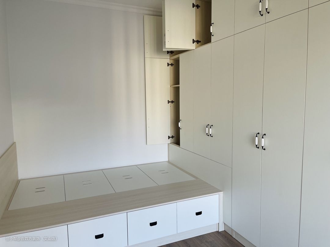 家里的小卧室因为面积的有限,打造成多功能设计可以是床也可以做储存空间,榻榻米床下面放被子,墙面的衣柜放衣服。