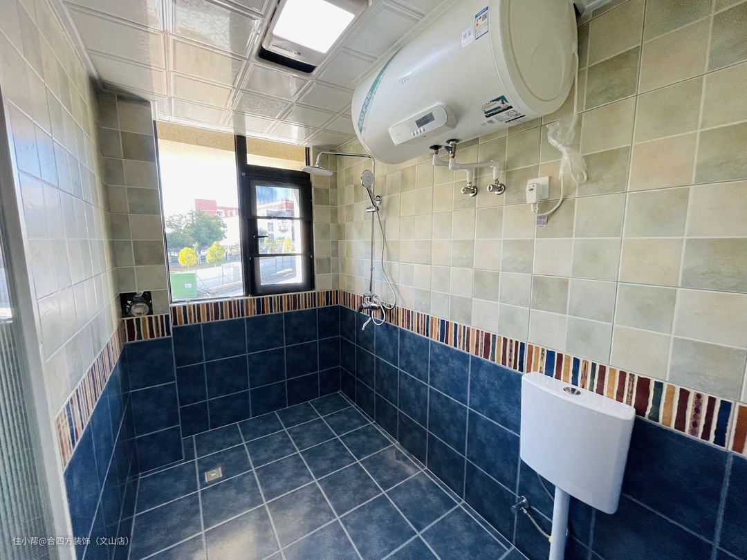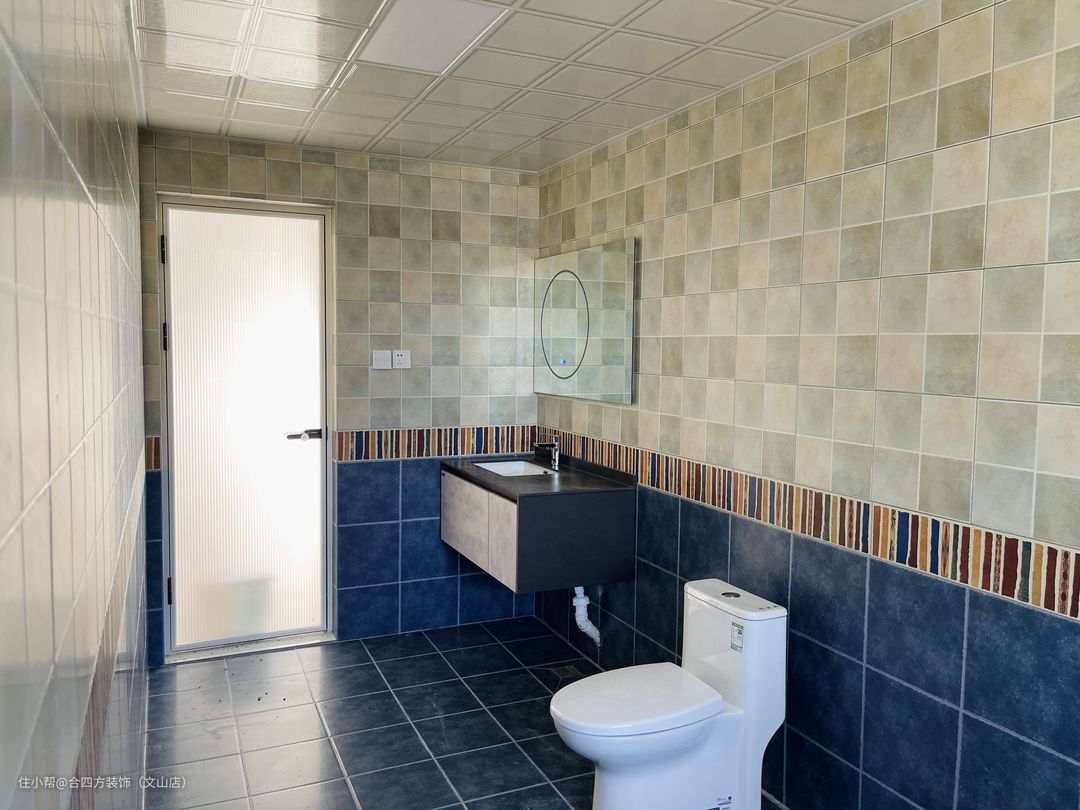 卫生间的设计相对简单,一扇彩虹玻璃门,墙上瓷砖中间做了腰线,上下瓷砖一分为二,上面深浅格子,下面蓝色让,整体层次丰富。贴合房主的需求,卫生间只预留洗漱台和马桶,突显出淋浴区的使用面积,简洁中也让浴室空间变大。