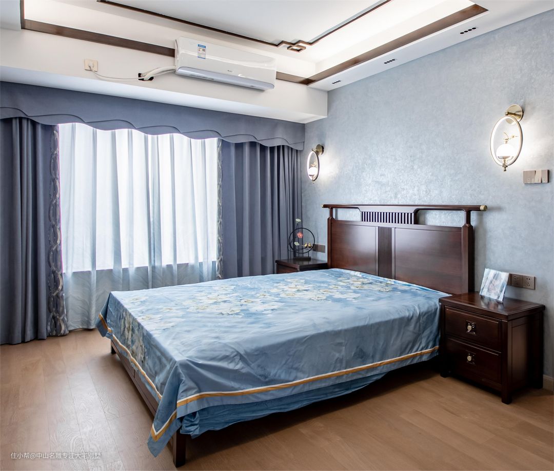隐藏灯和壁灯营造氛围,“官帽”式床头、天花角花线条等颇有雅致韵味。