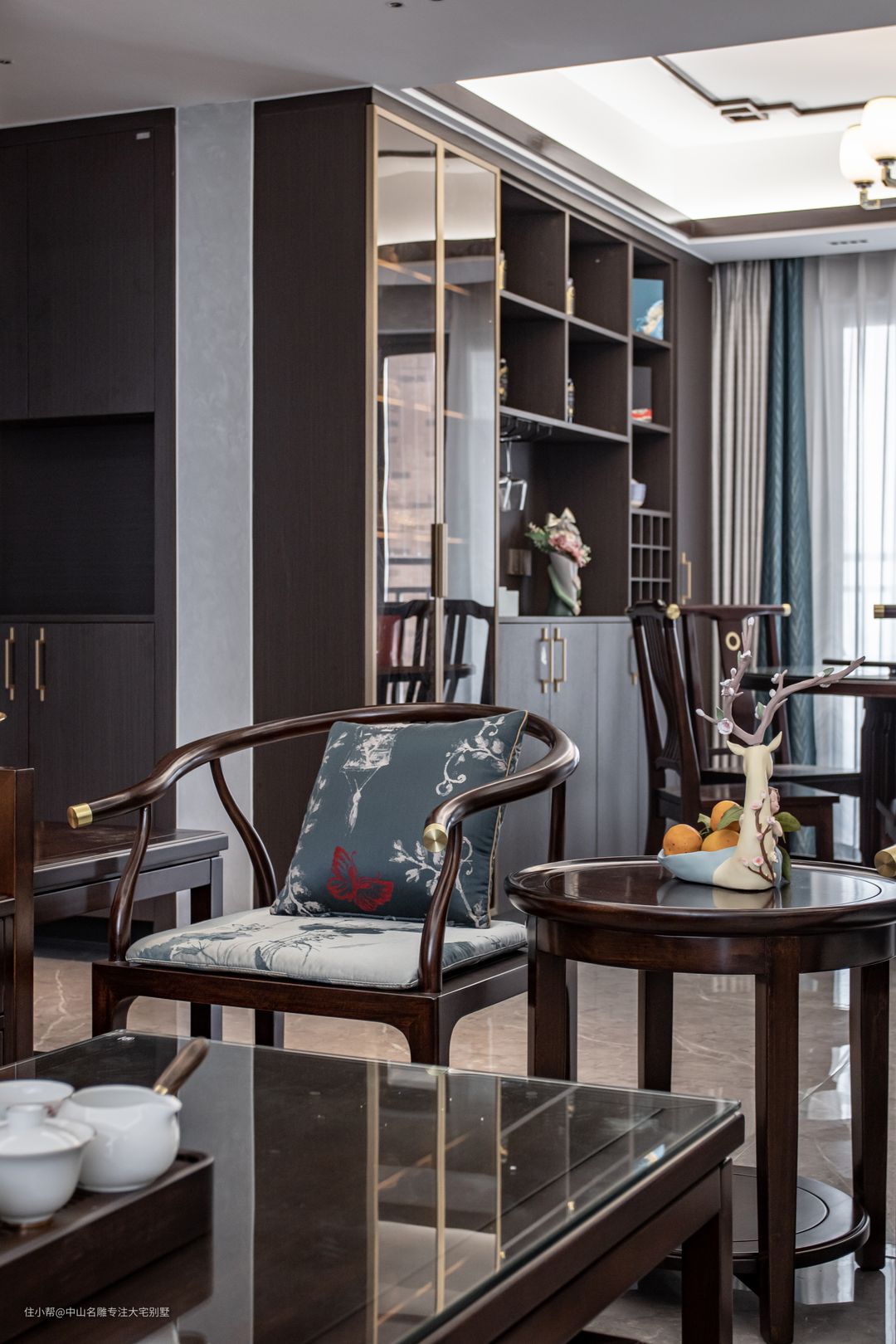 书香门第,“书”的容纳之所不可少,书桌在中央,后侧一面墙便是书架。转角两面是270°观景窗,基于本案中层高度,有种亭台的视感。这里是学习工作共通地,采光通风都要求舒适怡人。