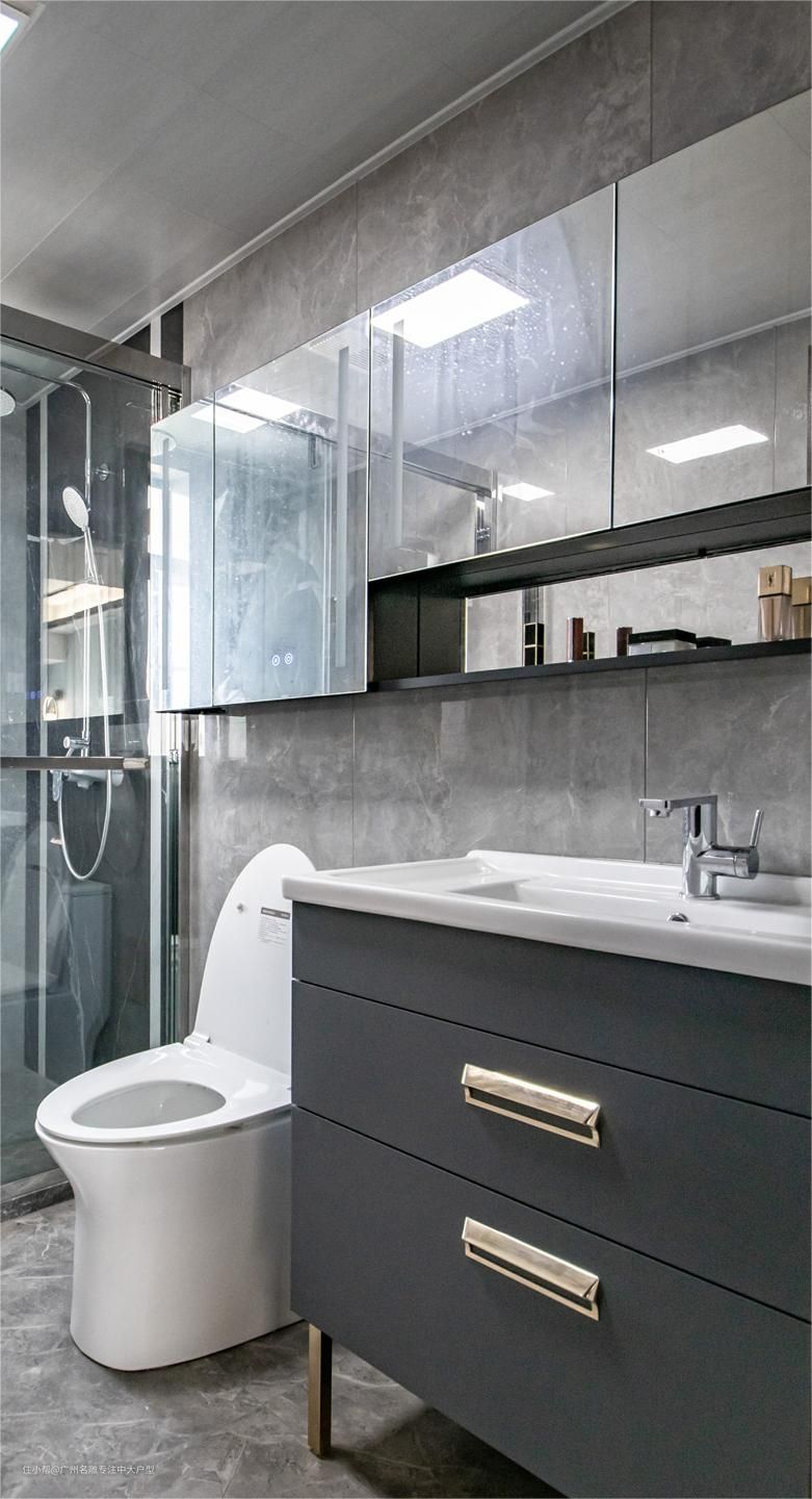 主卫是深蓝色柜不脱离卧室主调,瓷砖有通透感,如此素雅白色与大多风格百搭。