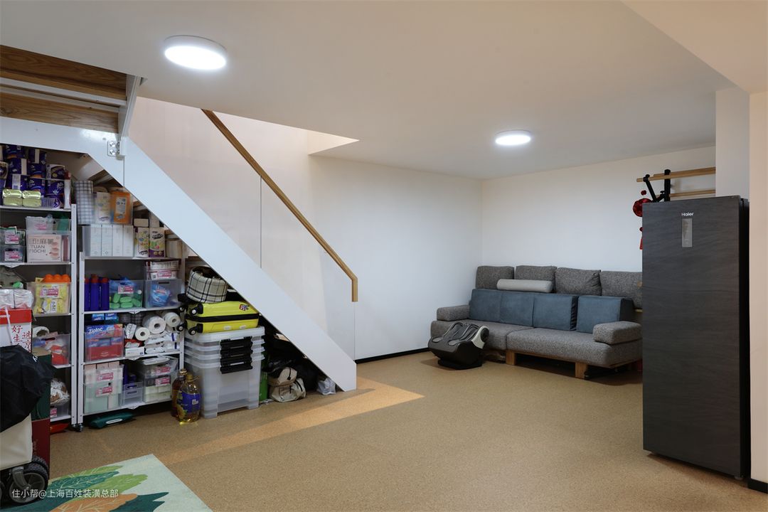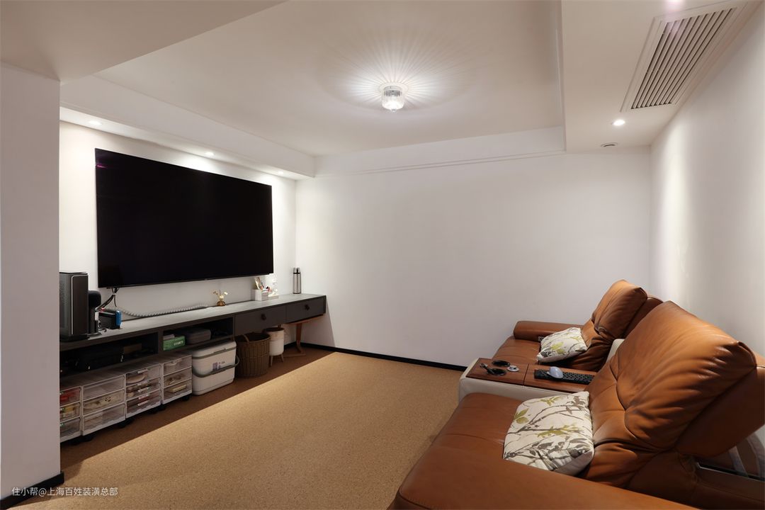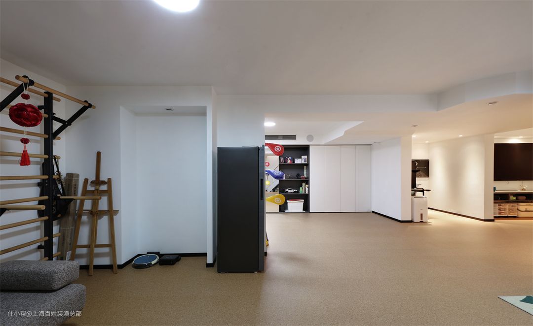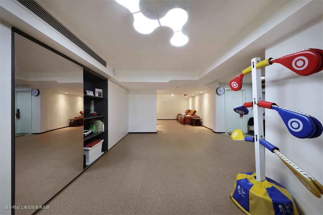 多功能B1层 Multi function room B1采用软木地板,不仅环保性能佳,隔音效果好,还能带来特别舒适的脚感。 在B1空间,设计师重点打造了一个集办公+运动+观影+电竞为一体的多功能空间,让生活更出彩。 办公区:独立的办公桌+书柜,满足学习办公需求。 运动区:利用其中的一面墙设计成镜子,在这里打打拳、练练瑜伽,超级放松。 观影区:超大屏电视搭配观影专用沙发,打造家庭专属的私人影院。 电竞区:“电竞”活动,已经成为一种不可或缺的休闲放松活动,这也是新时代社交方式之一。墙面通过个性化的设计,增加电竞的氛围感。 这样多功能,高颜值的地下室设计,你羡慕了吗?