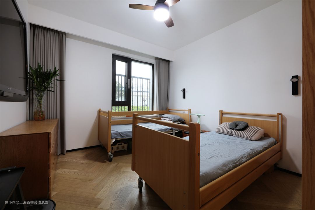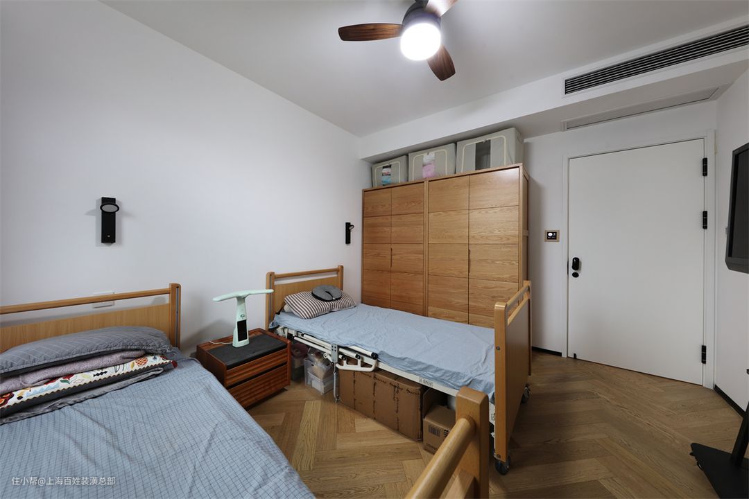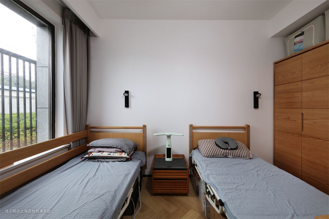 次卧老人房采用适老化设计,分床设计以及床头上各自安装智能壁灯,互不干扰,让老人都能享受相对独立的睡眠空间。