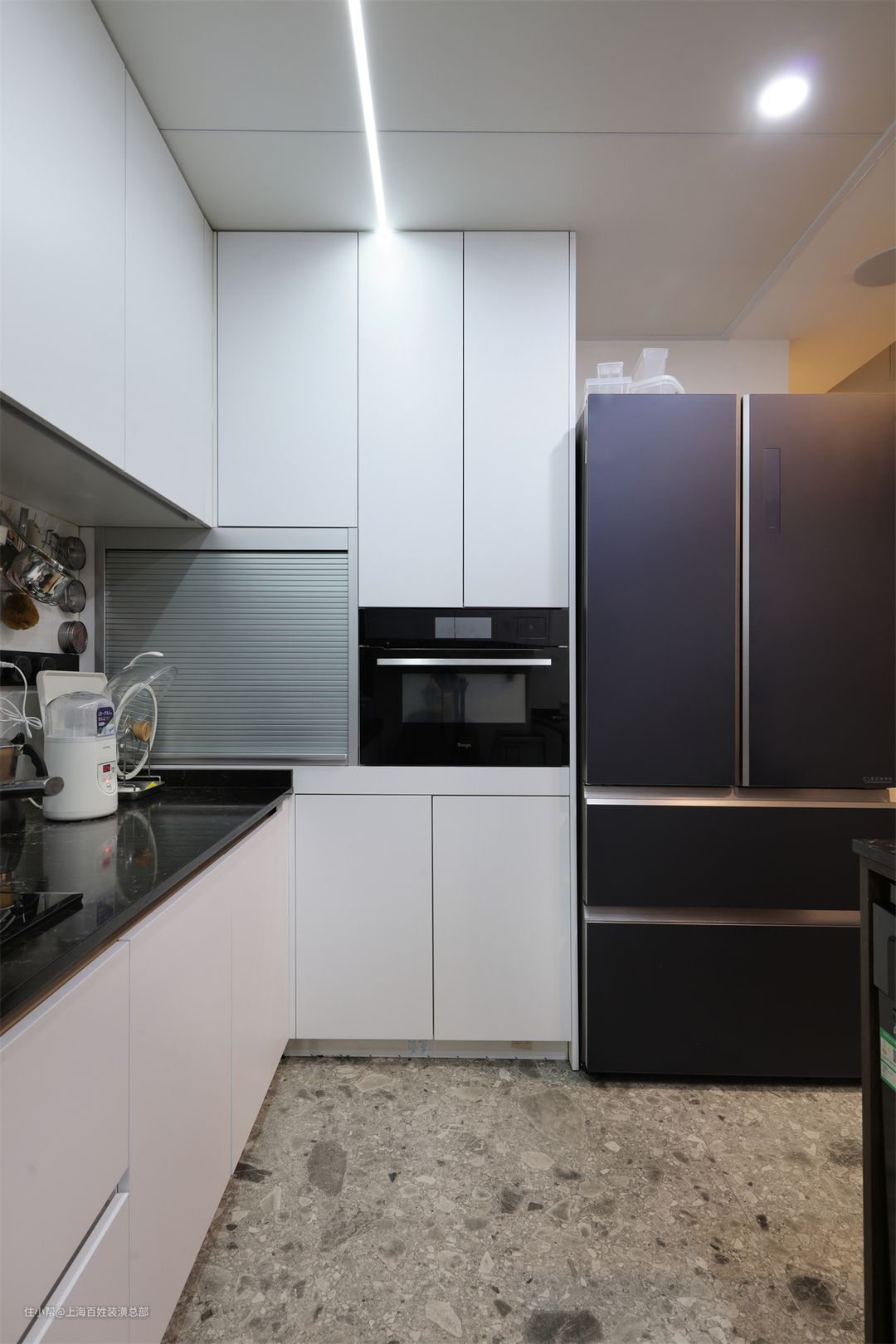 厨房采用开放式设计,同时在墙面采用带有磁吸功能的珐琅板,搭配磁吸餐具置物架、砧板、厨房纸巾架、调味盒等等,都可以吸附在上面,承重也不成问题,实用又美观。