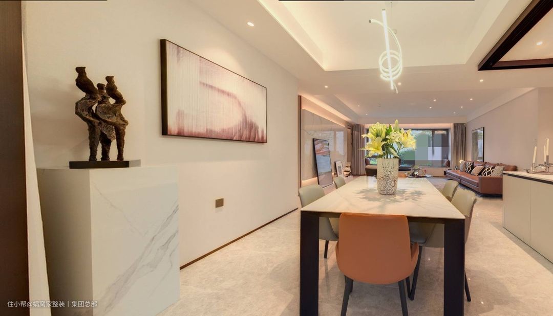 餐厅借助开放式的厨房设计,摆放岩板餐桌,让四周不受约束,避免空间阻隔,增加互动性同时,也能让就餐变得舒适自然 别致的线条艺术灯,充满艺术的造型感,把空间的精致氛围感提升到最大