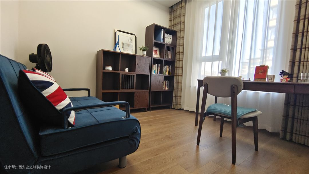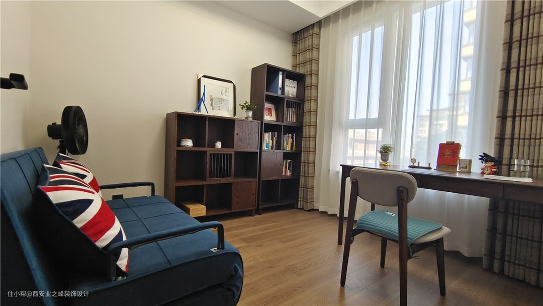 书房使用黑胡桃色系的组合书柜及书桌以及米字格的窗帘装饰,让整体空间感即安静又舒适
