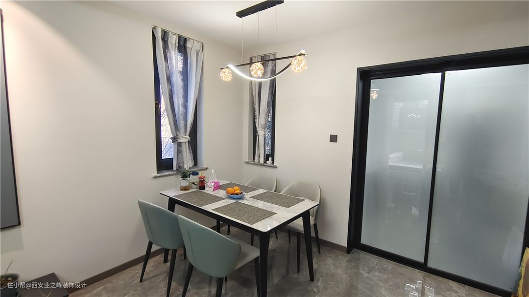并没有专门预留餐厅空间,简单的四人位餐桌满足实用功能,墙面以浅色为主,与木面餐桌布艺靠背椅组合给营造温馨的氛围。