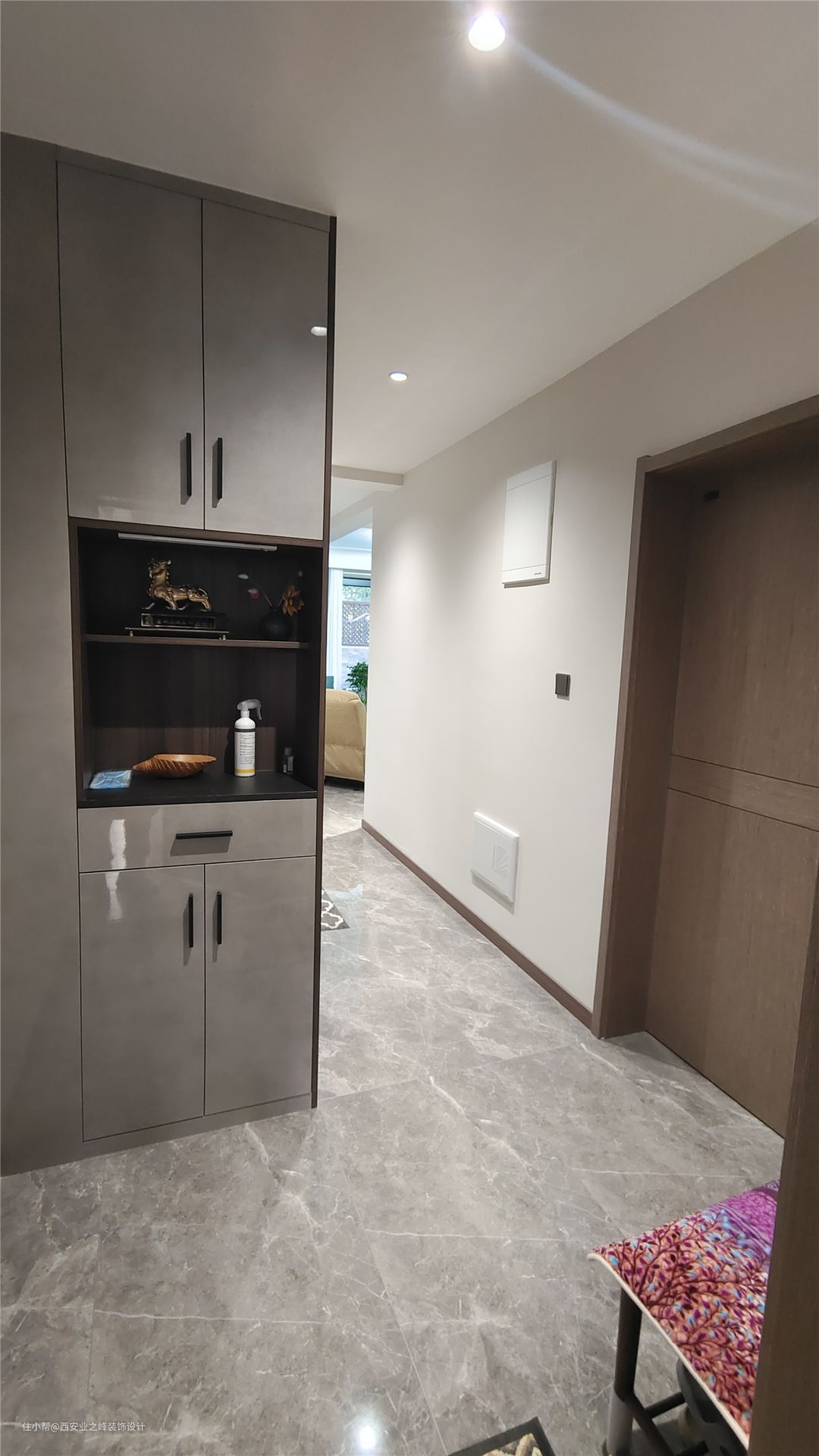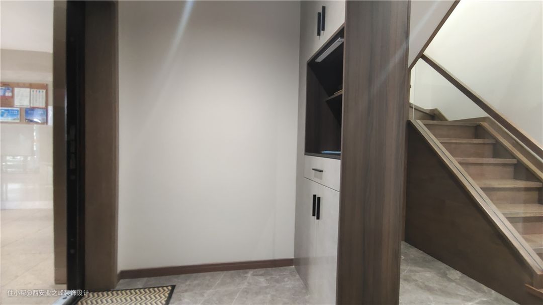 玄关设计,满足储物功能的同时弱化门口下水立管的方式,做了一个兼储物及鞋柜功能的玄关设计,也解决了进门直接看见楼梯的问题,增减空间感。