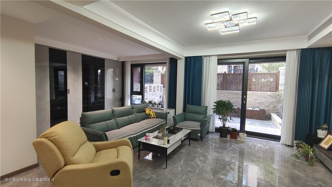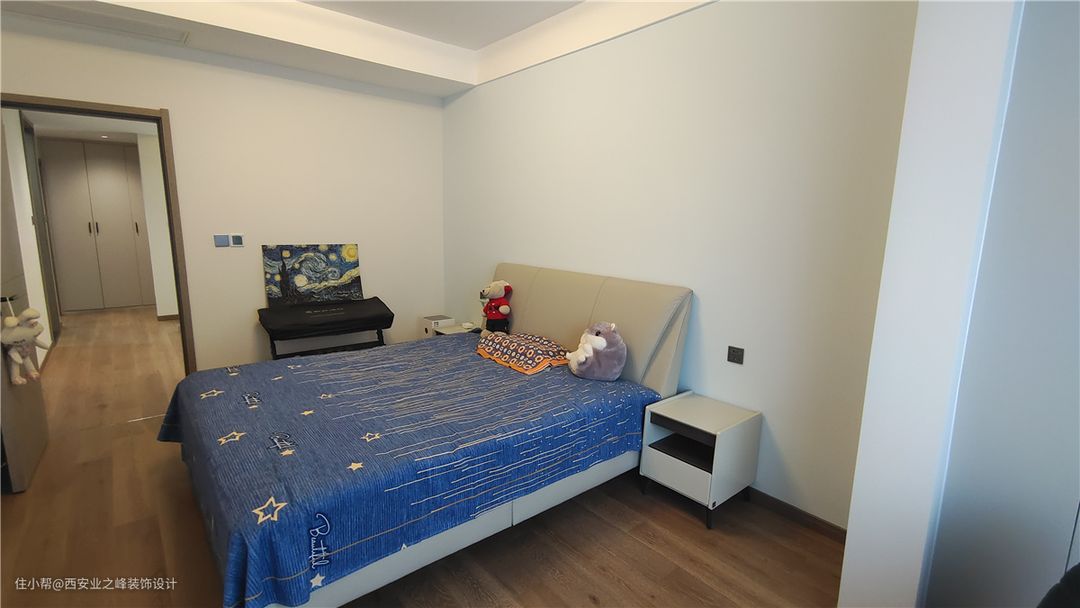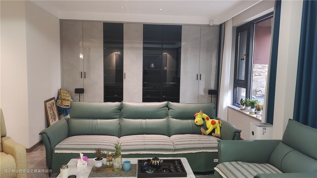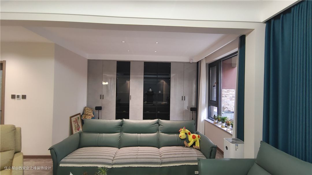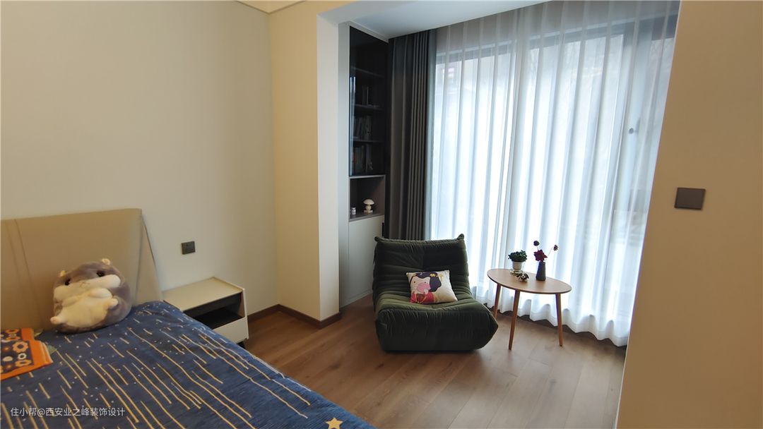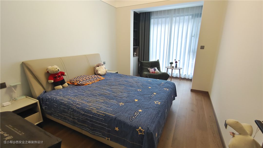 此空间作为孩子居室,孩子偶尔回来居住,整体墙面色系考虑浅蓝色和杏子灰色系搭配区分开主次,原木色系的门及木地板,暖色系皮质卧床搭配牛油果绿的休闲沙发融为一体,让空间慵懒舒适。