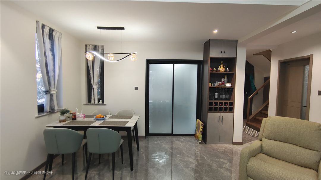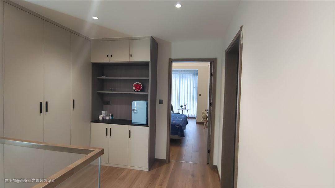 顺着楼梯步入二楼空间,客卫生间改变了门洞的开始方向,增减楼梯上来后的空间感,将原来二楼墙体拆除后做了一个水吧区,增加视野感的同时增加使用功能。