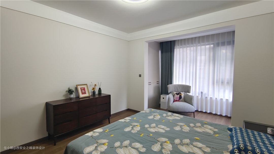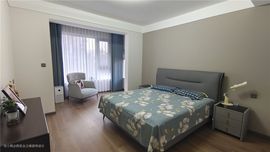 卧室整体感觉以咖色乳胶漆色为床头背景墙,浅灰色为大面积颜色,搭配深灰色皮质床及黑胡桃色的五斗橱,彰显整体极简感觉,阳台放置休闲座椅,透过通透的玻璃室外美景尽收眼底,让人心旷神怡。
