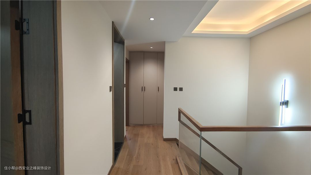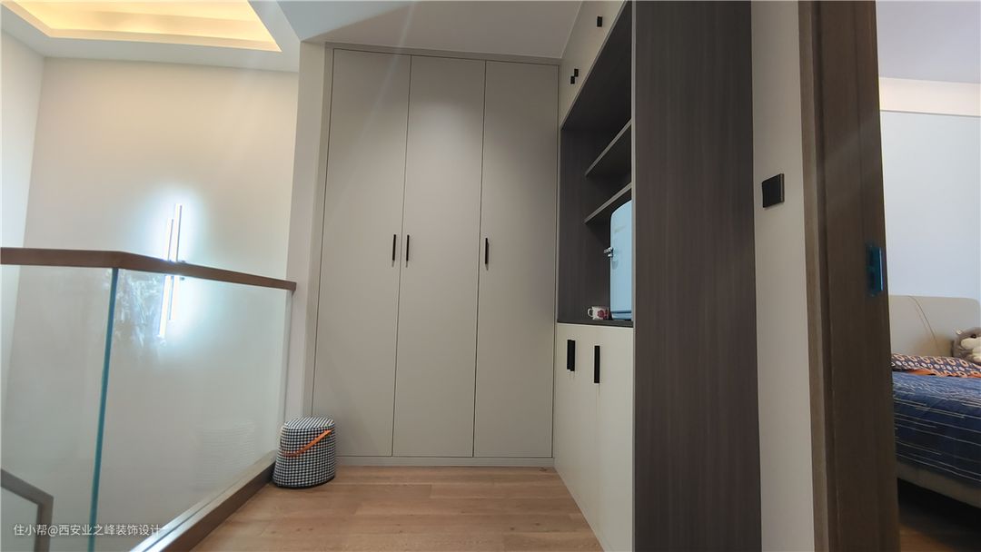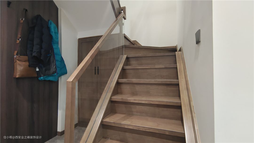楼梯是在原来钢构楼梯的基础上做了加固,整体釆用同柜子及木门色的橡胶木来做装饰,楼梯使用玻璃扶手,让整体空间感更通透更敞亮不显压抑。