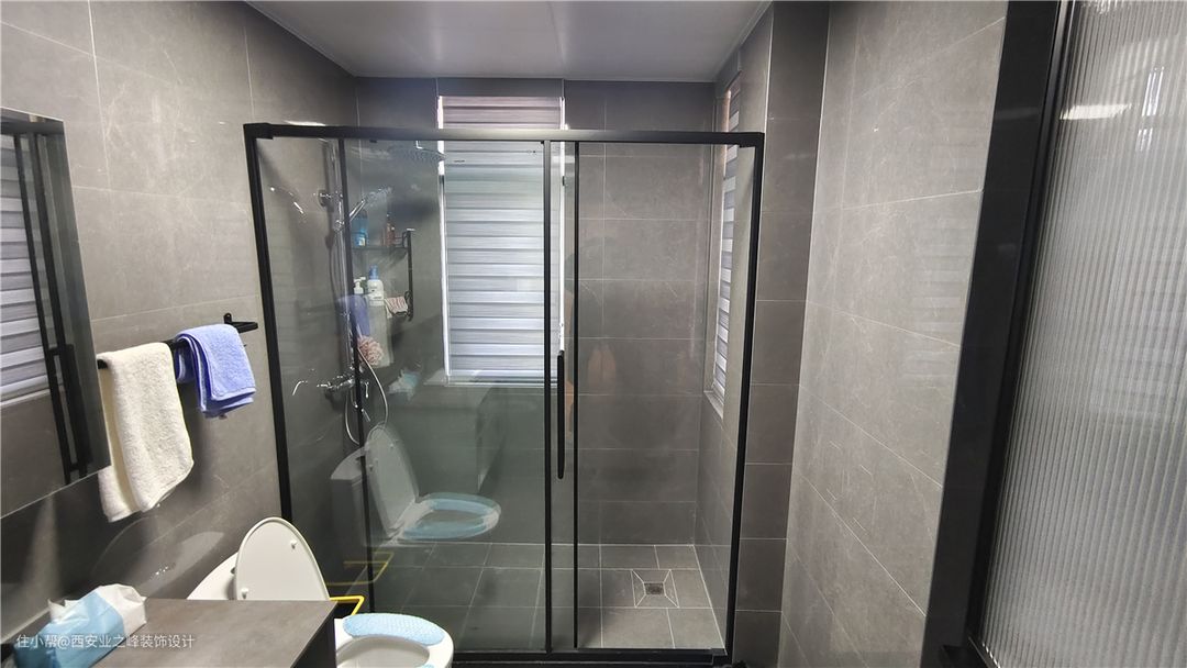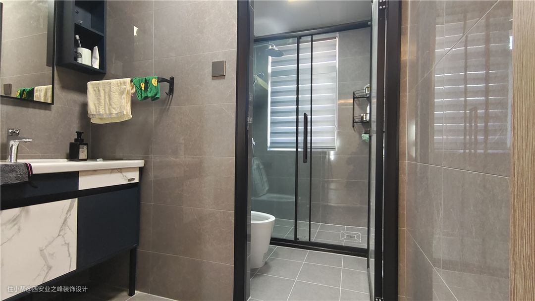 卫生间做干湿分离设计,淋浴区采用透明玻璃隔开,让卫生间不会过于闷沉,整体使用灰色瓷砖铺贴,便于日常收拾打理。