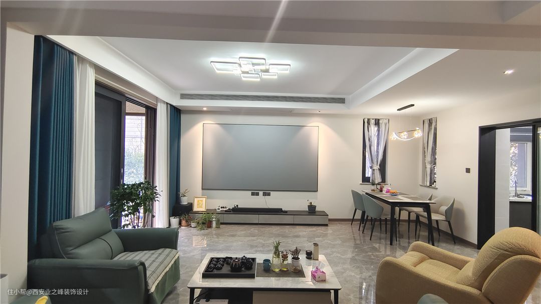客厅原始结构有一部分为挑空区域,设计考虑房屋实用性考虑将此区域整体搭建增加二楼空间面积,客厅设计整体以简约为主采用主灯的方式,以灰色和木色为主色调,用色简洁大气又不失温馨,搭配大理石瓷砖使整个空间更有质感。烘托出不一样的空间感和点亮视觉的作用,简单百搭耐看。整体空间搭配的软装,深浅色系搭配、特殊造型的灯具搭配简单的吊顶,线条利落流畅富有时尚感。
