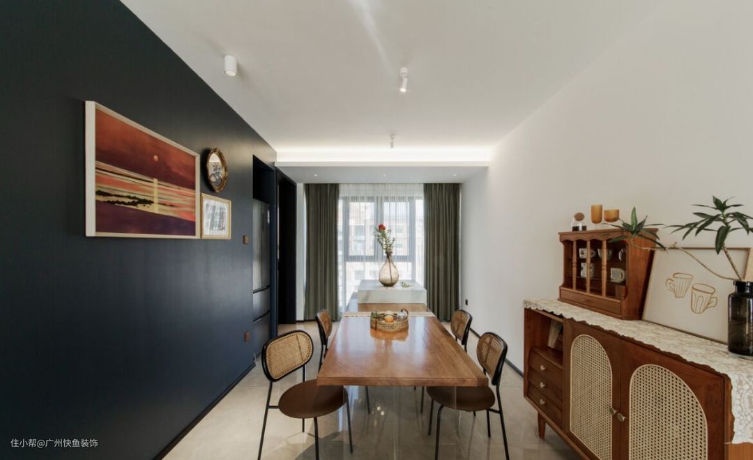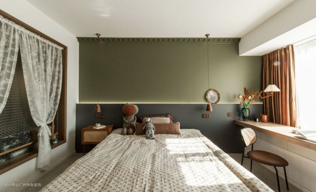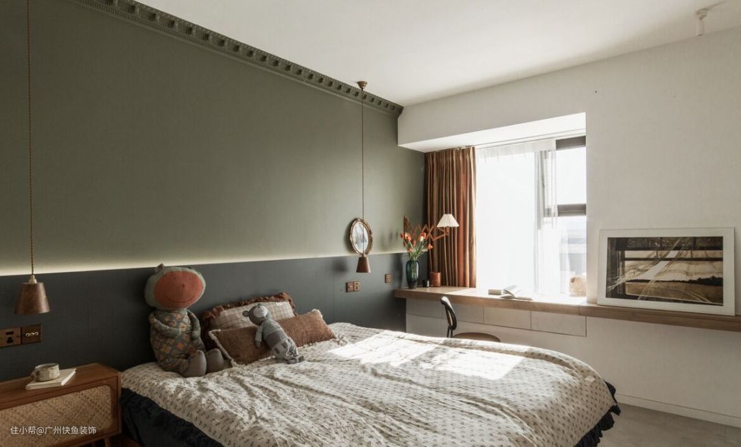 绿色的背景墙给人一种清新静谧的感觉,靠窗做了长排的书桌,台面宽敞整洁,可以兼具办公桌和梳妆台了。