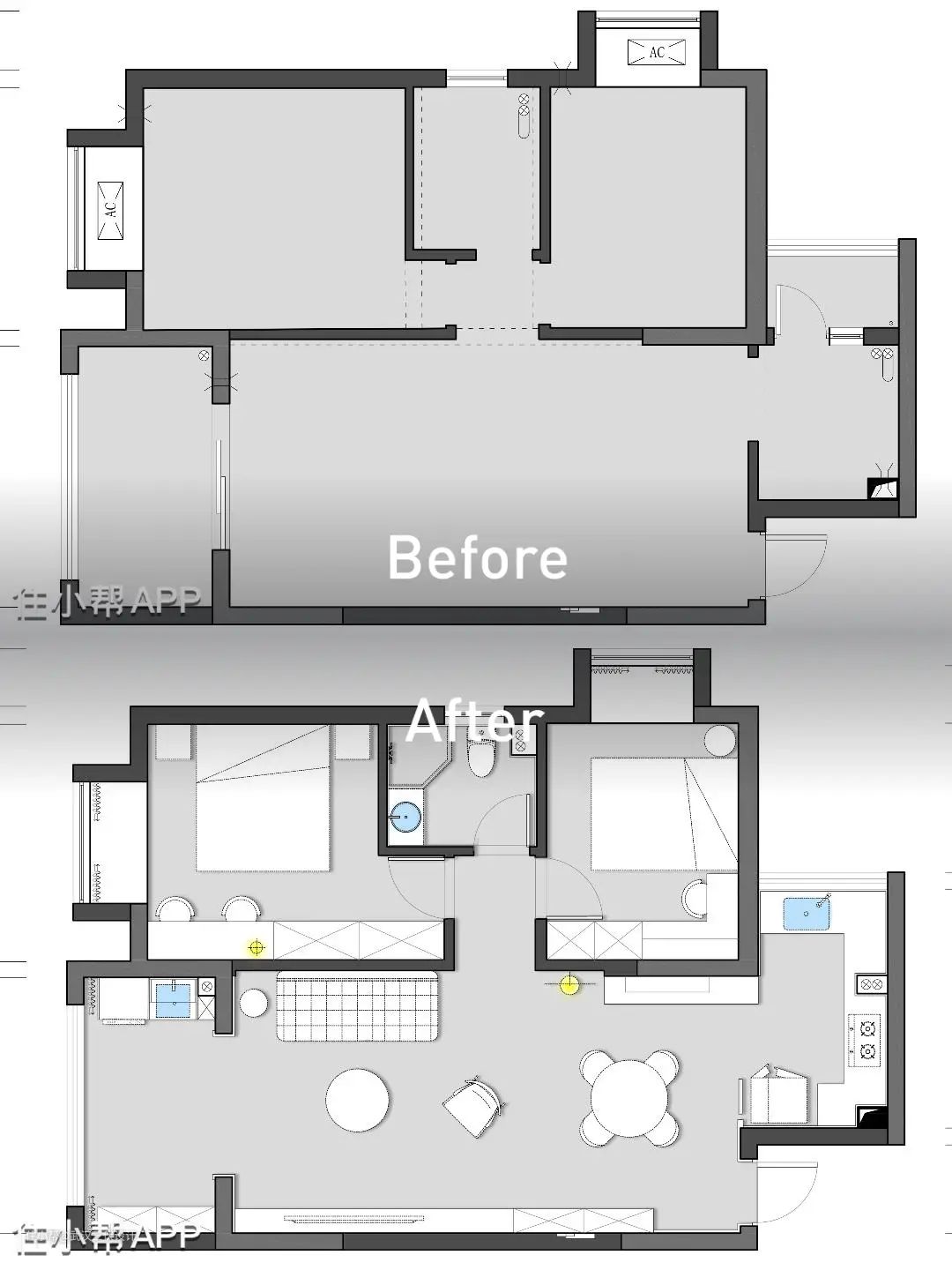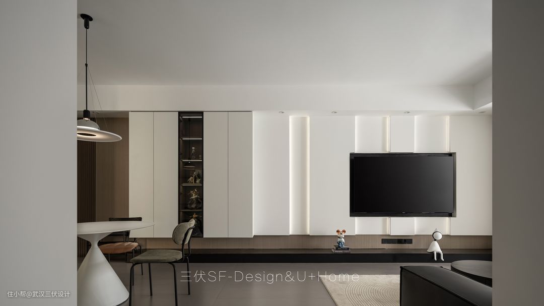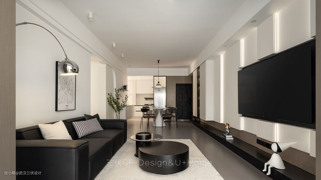 结合居者对空间的功能需求和审美偏好,以黑白简约配色主导空间,保持视觉上的清爽利落。墙面做艺术化处理,结合灯带系统,引导空间的温暖氛围。餐厅、厨房、客厅、阳台,通过拆除隔断,各区域之间有效链接,用交互性空间,强化家人之间的交流。 1.厨房与餐厅隔墙拆除,打造半开放烹饪空间,公区更显敞亮开阔。 2.玄关柜与电视墙连接,加强视觉延伸感,玄关与客厅无缝过渡。 3.阳台与客厅梭门拆除,优化公区采光条件,两侧定制收纳柜,打造家务阳台。 4.主卧床尾布置书柜和高柜,解锁卧室储物、阅读功能,提高屋主生活质量。