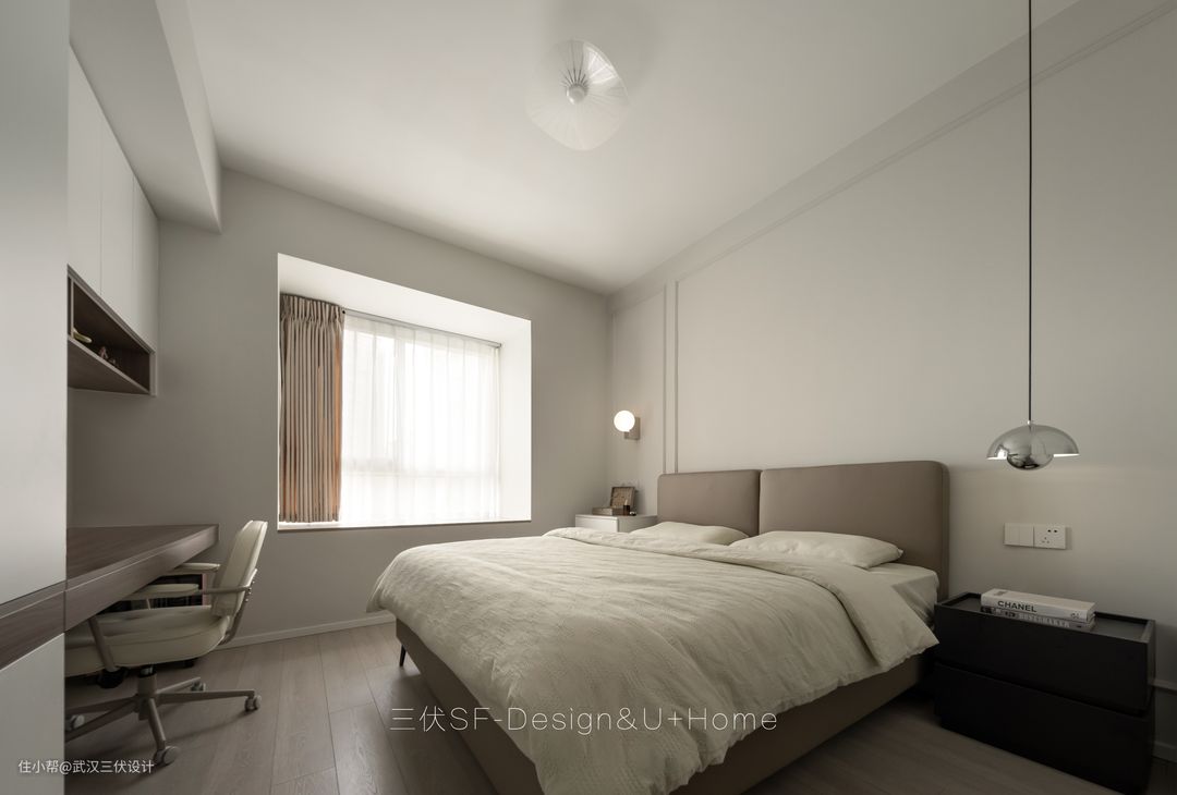 奶油色和木色主导的空间,打造沉浸式入梦空间,加上飘窗处引入的和煦自然光,睡眠空间自带温柔滤镜。 床尾空间定制一体的高柜和书桌,解锁卧室的储物办公功能。书桌下方挑空,办公椅不用时可收入下方,丝毫不会影响卧室内的转圜动线。