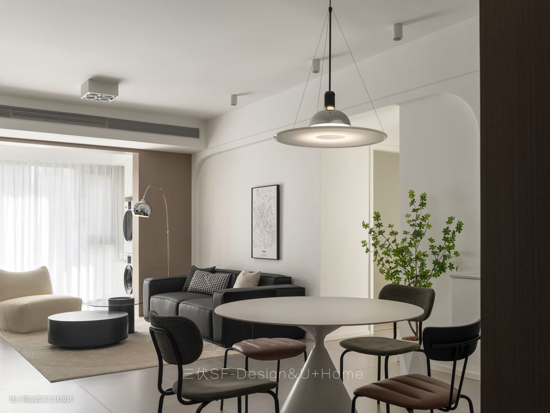餐厅与客厅一脉贯通,经典圆桌,聚起一日三餐的美好与温情。上方吊灯形状与桌面呼应,光域围拢下,饭菜变得更为精致美味。
