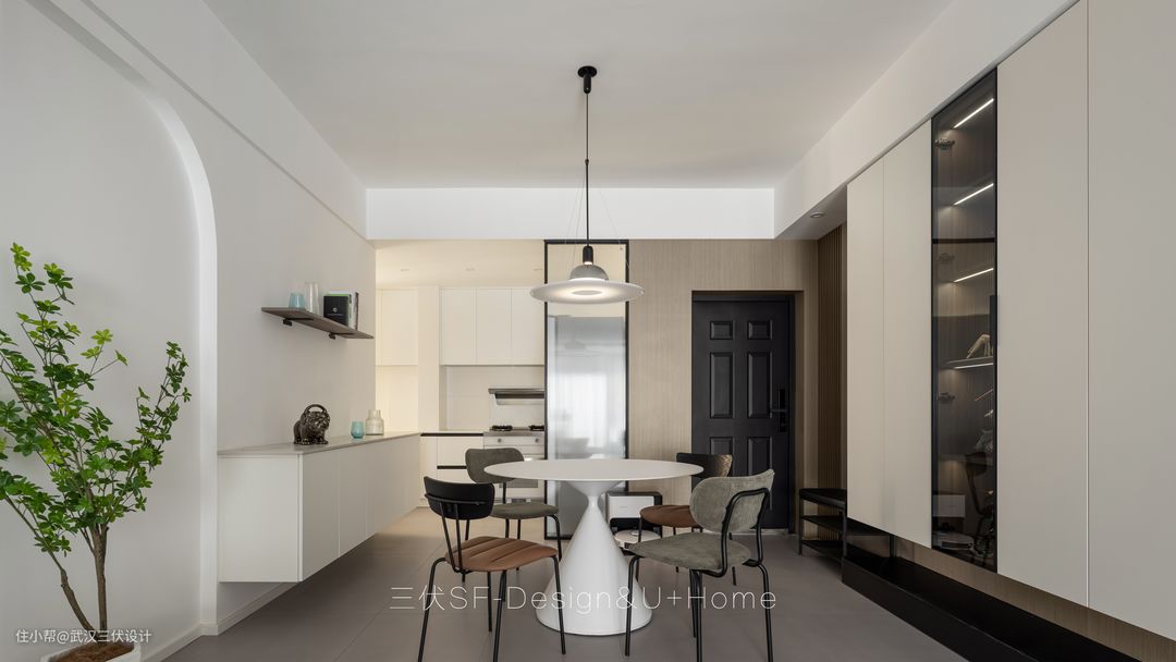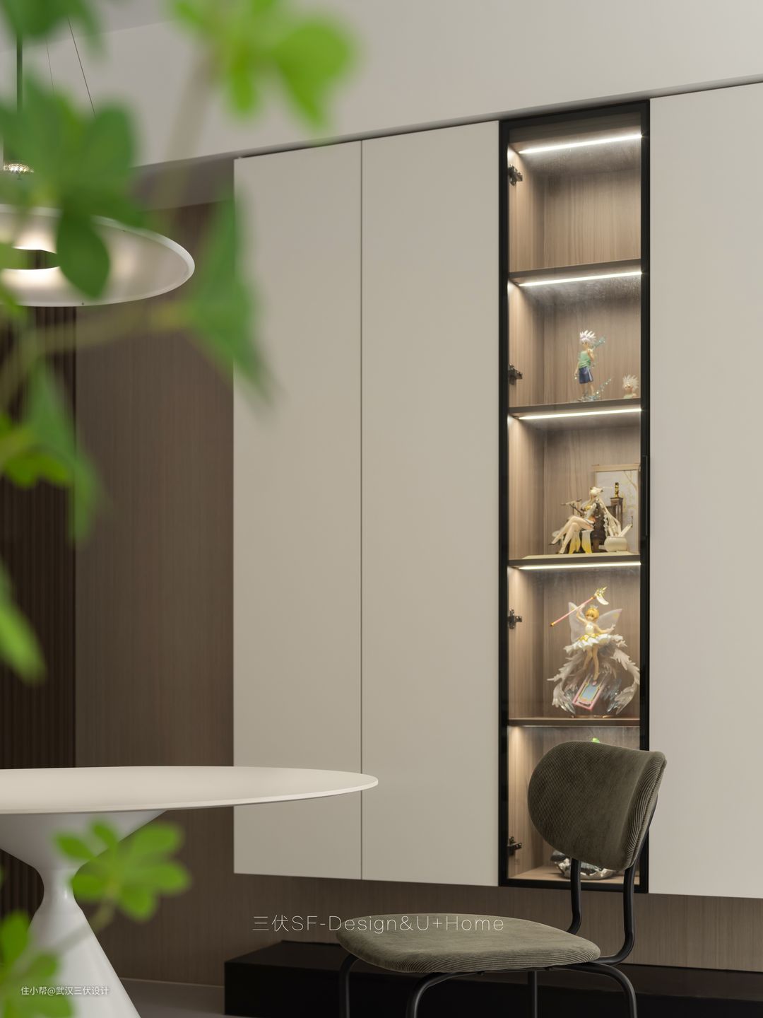 厨房与餐厅隔断拆除,局部以玻璃代替厚重砖墙,将烟火之地的舒适度与开阔感拉到最大。 入户既见餐厅,餐厅背景墙与玄关柜融为一体,局部设计分层展示柜,夫妻二人收藏的手办尽可收入其中,用爱好装点生活,居所显现出别致韵味。