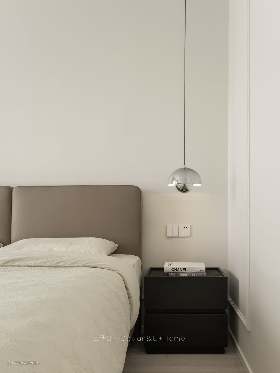 床头背景墙摒弃繁复装饰,利落的PU线条,制造出框域感,打破白墙的单调乏味。利落线条,将居者内心的情绪与感知叠加,丰沛充盈的内在,才能撑得起对生活澎湃的热爱。 两侧的金属吊灯,极具视觉表现力,光影玲珑,以恰到好处的姿态点缀着床头空间。
