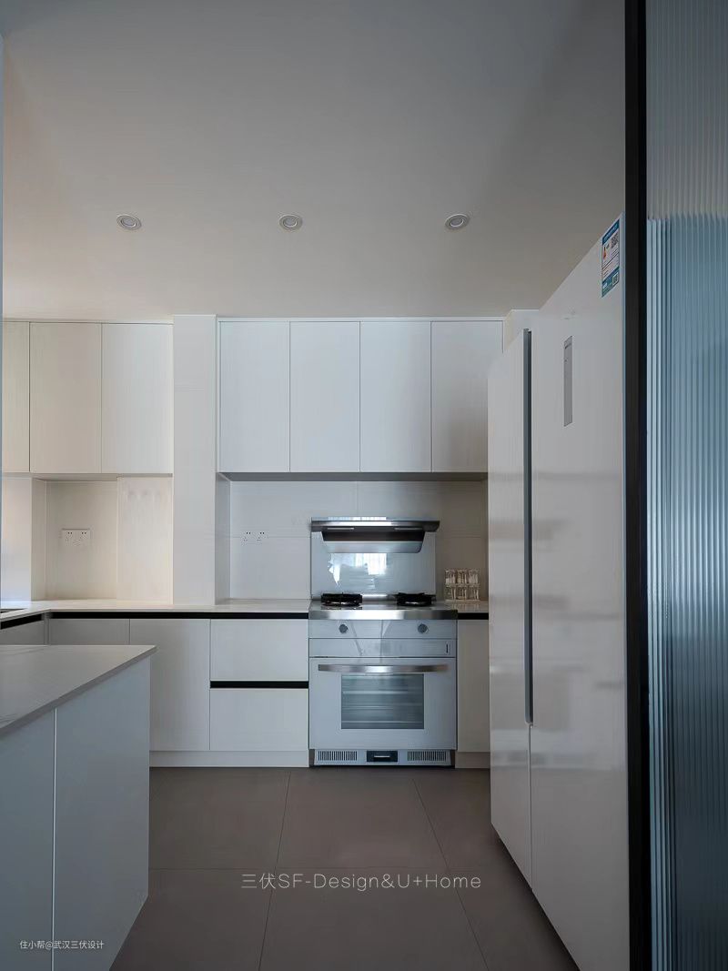 半开放式厨房、白色橱柜配灰色地砖,这个极简厨房是业主最满意的地方。