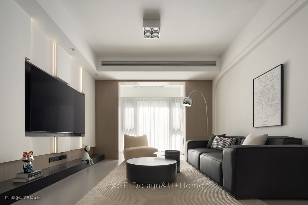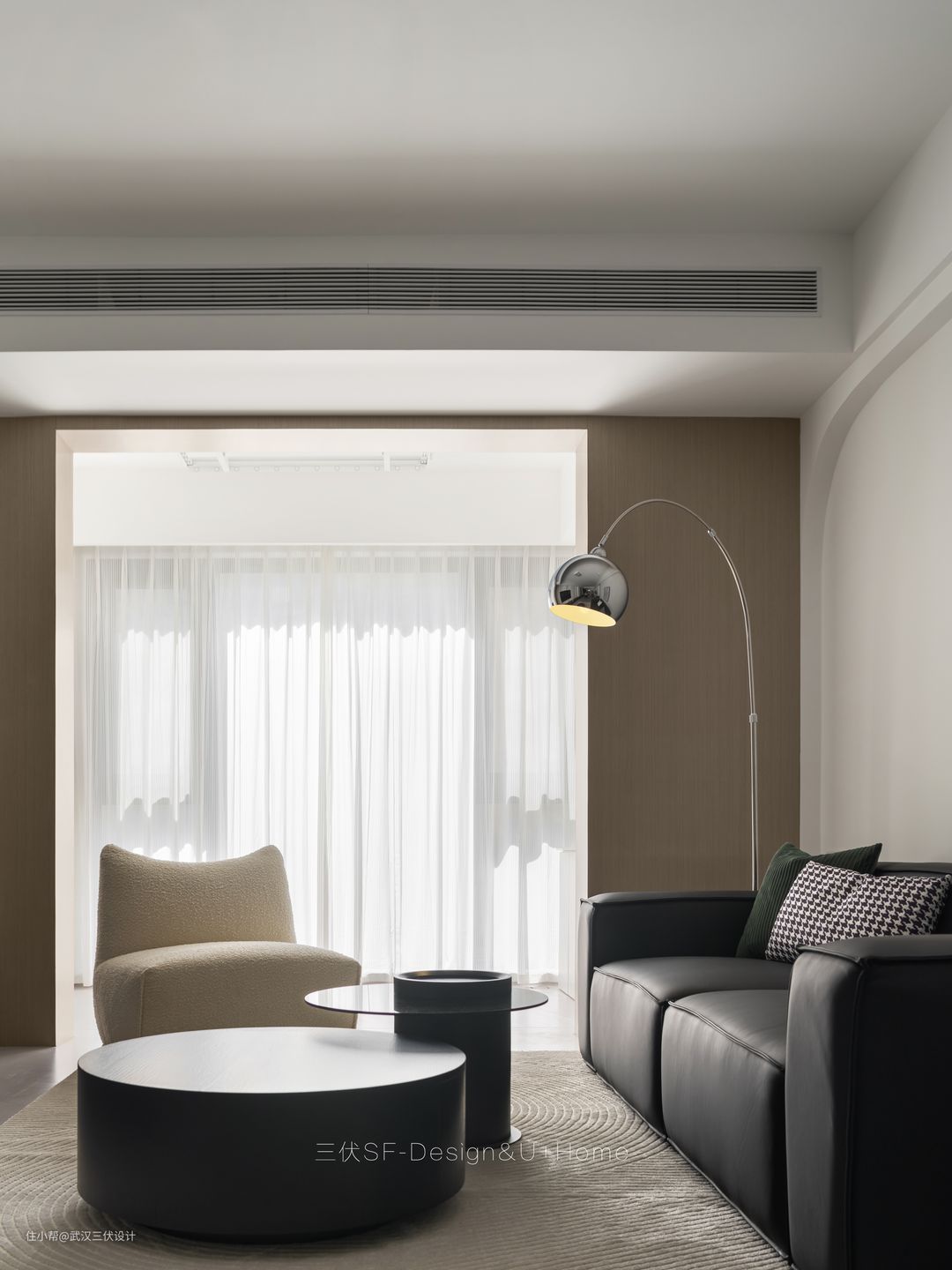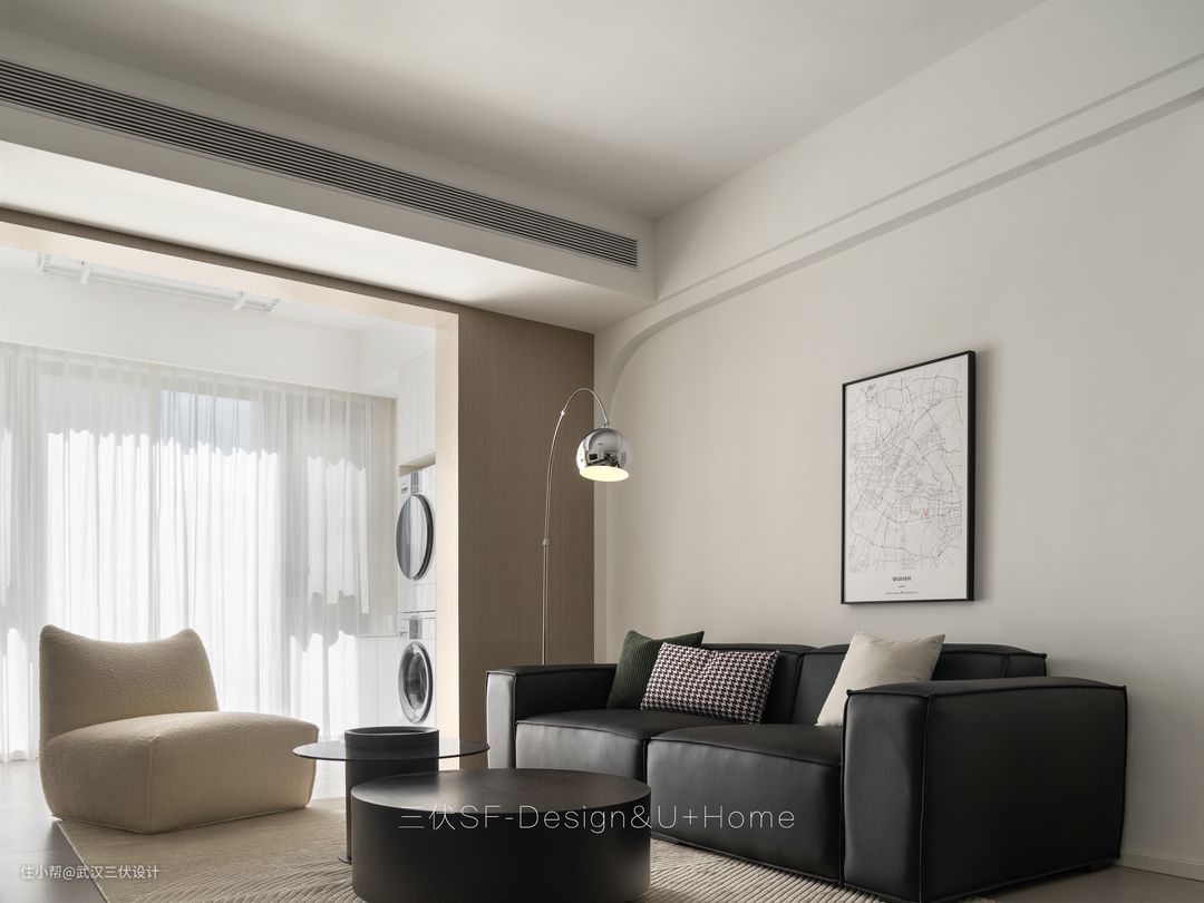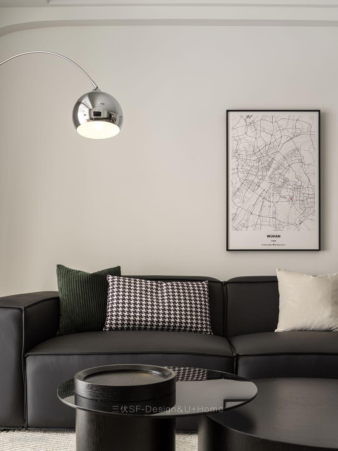主沙发、茶几均选稳重黑色,皮质、玻璃、石材不同质感纹理相互碰撞,精致体现在细节之处,消弭了简约配色的呆板无趣。奶呼呼的单人沙发,拥抱年轻化的潮流艺术,穿透时尚品质,而无限接近真实的生活场景。 2.4米黑色皮质沙发是女业主花心思买来的,搭配银色金属落地灯,俯身照亮沙发一角,配合顶部筒灯,解锁客厅更多的光影模式。