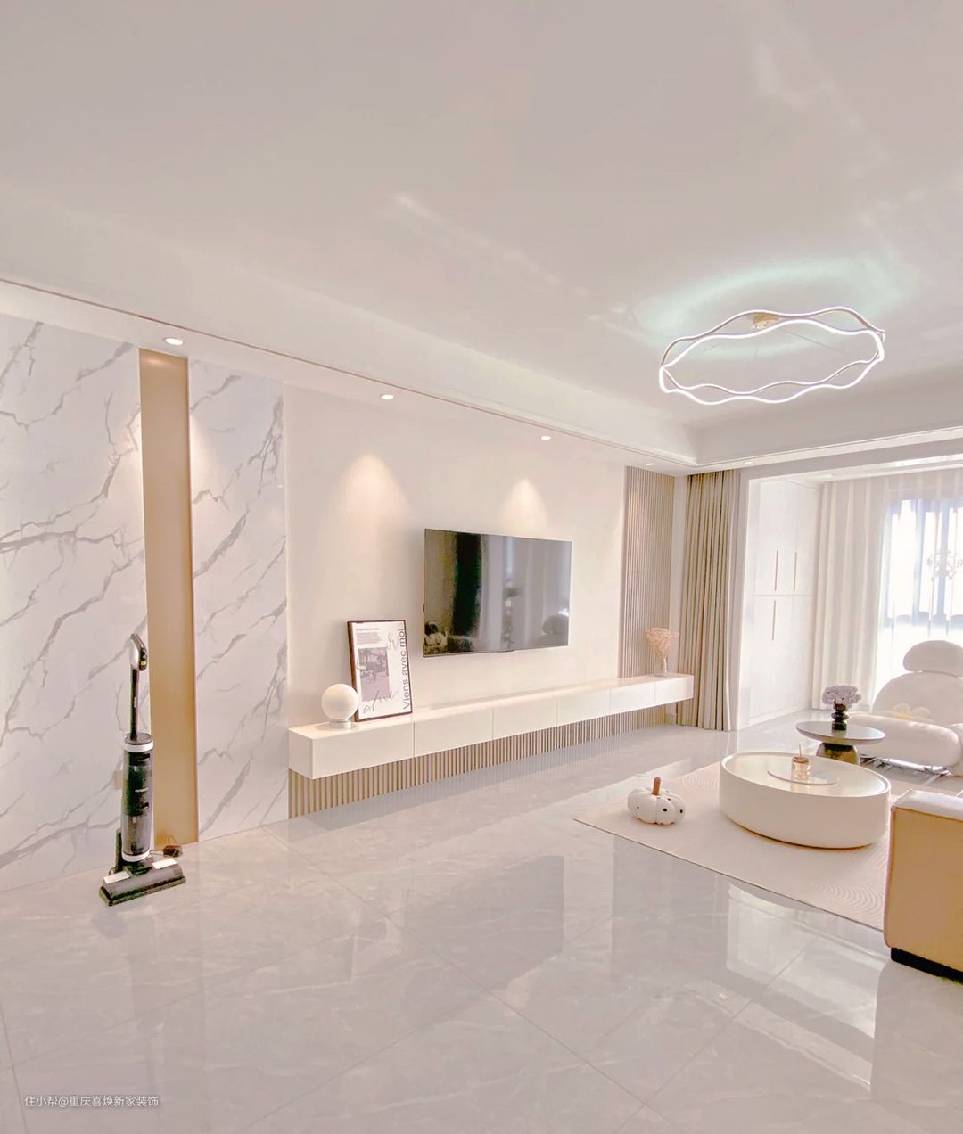 客厅作为公共区域且待的时间最长的地方,采光非常重要,所以设计师把客厅与阳台做了拉通设计,这样既保证了采光又增加了美观度。与两个区域的交界处选择了遮光窗帘这样既保证不耽误进光,也能有效的区分两个区域。 地面通铺白灰色瓷砖,形成视觉上的统一,增加房屋的空间感。整个墙面也是通刷浅杏灰系的乳胶漆,视觉上干净整洁却不失俏皮。