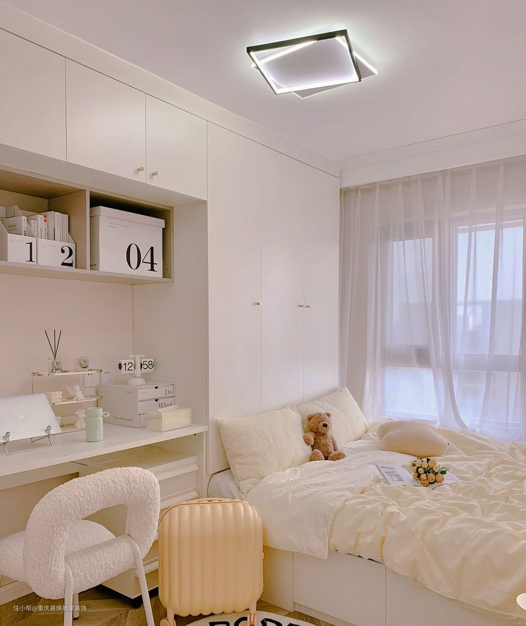 窗帘选择的是白色窗纱,这样不仅不影响采光,还可以把房间的氛围营造的如梦似幻。还在床边选择了一个造型奇特的床边桌,既好看又能放一些小东西,增加房间的独特性。
