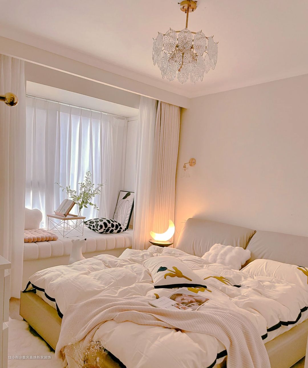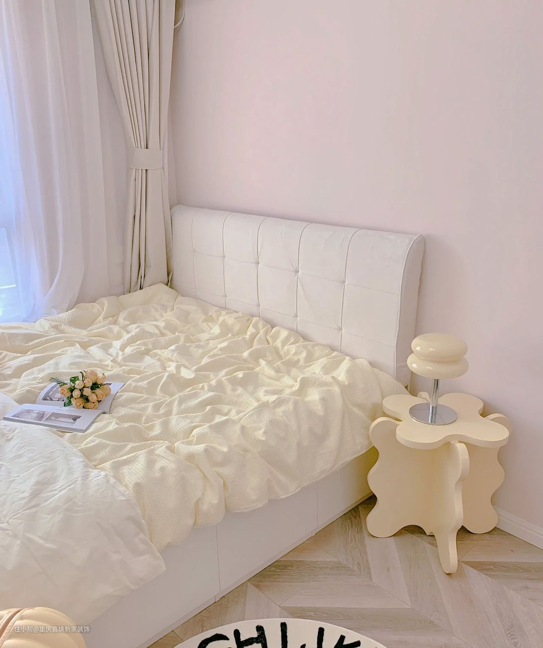 窗帘选择的是白色窗纱,这样不仅不影响采光,还可以把房间的氛围营造的如梦似幻。还在床边选择了一个造型奇特的床边桌,既好看又能放一些小东西,增加房间的独特性。