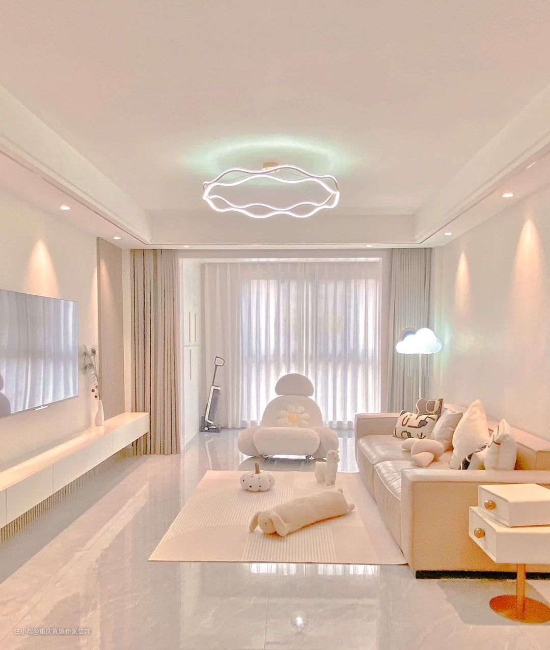 客厅作为公共区域且待的时间最长的地方,采光非常重要,所以设计师把客厅与阳台做了拉通设计,这样既保证了采光又增加了美观度。与两个区域的交界处选择了遮光窗帘这样既保证不耽误进光,也能有效的区分两个区域。 地面通铺白灰色瓷砖,形成视觉上的统一,增加房屋的空间感。整个墙面也是通刷浅杏灰系的乳胶漆,视觉上干净整洁却不失俏皮。