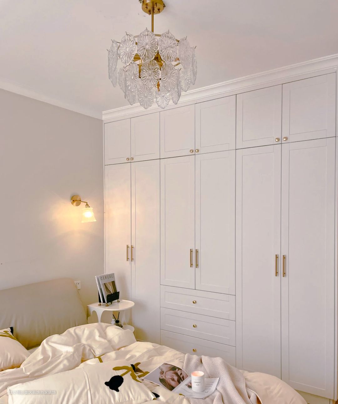 主卧也是做减法设计,不去利用多余的装饰和鲜艳的色彩来装饰,而是利用简洁的线条进行整体勾勒,增加整个房间的舒适度。墙面通刷浅灰色乳胶漆在,增加质感,顶部则选择用水晶型灯具,在灯光的营造下不显廉价反而高贵十足。 床头两边还分别安装了两个复古调的壁灯,平时不开主灯的情况下,开着它不仅烘托氛围,还可在看手机的时候开着它保护眼睛还不刺眼。 距离床边合适的位置定制了整面柜子,方便日常储物,还做了不同格局的设计,满足不同物品的储存。且与床边算好了距离,避免开关不方便。