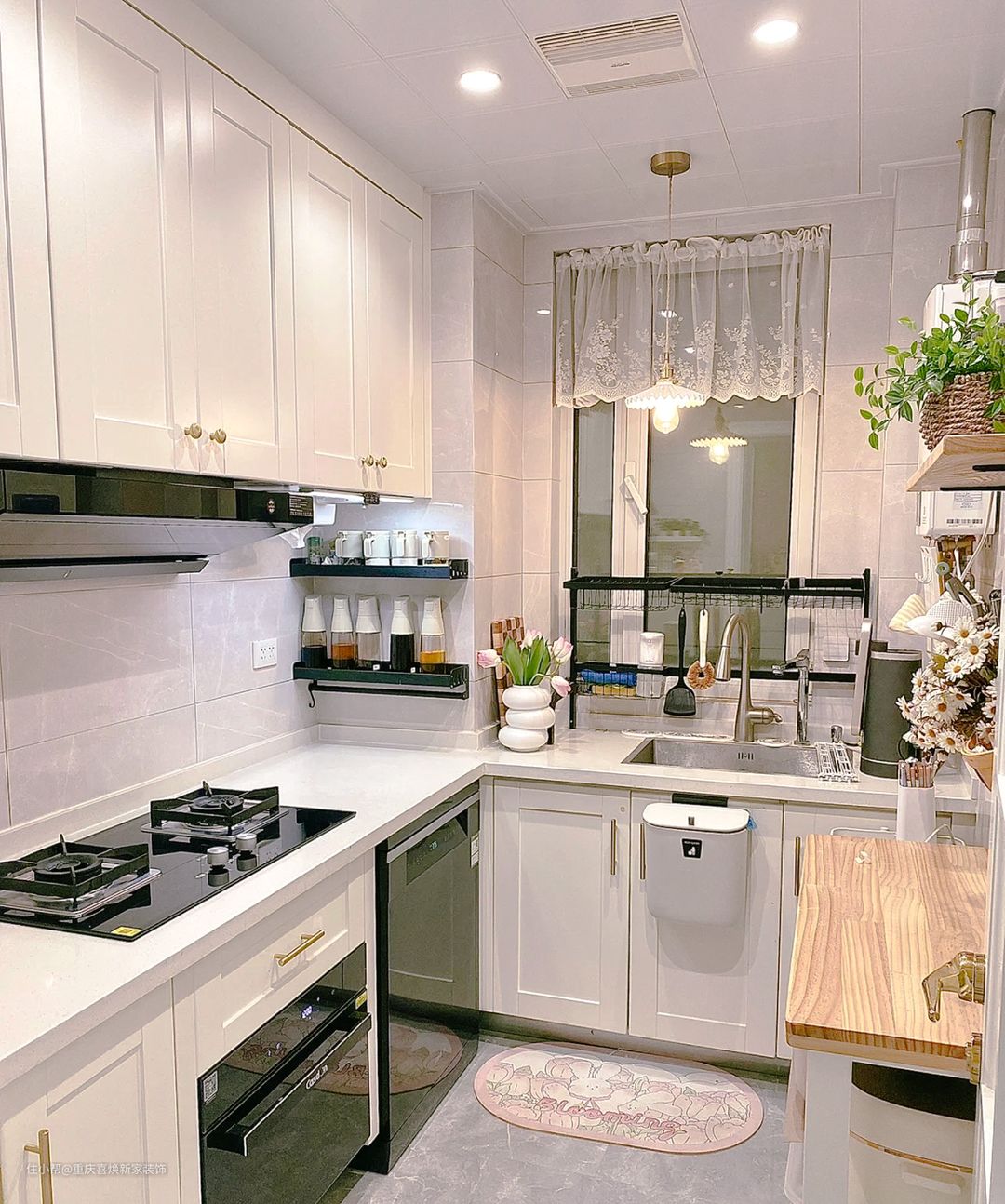 厨房呈L型,把厨房的位置利用到极致,L型也很好的发挥出它的功能,把厨房的每个地方都最大化。以白色系为主,地面通铺灰色系瓷砖,方便清理打扫也使空间更加通透。定制吊柜地柜把上下位置都很好的利用起来增加储物,再也不用多的锅碗瓢盆、粮油米没地放了。且柜门上金属系的把手也给整个橱柜增加的质感。 顶部是选择的筒灯,这样不仅使照明更加均匀舒适,也拉高了层高,使人在这个空间不显局促。