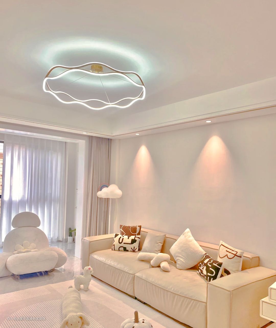 客厅作为公共区域且待的时间最长的地方,采光非常重要,所以设计师把客厅与阳台做了拉通设计,这样既保证了采光又增加了美观度。与两个区域的交界处选择了遮光窗帘这样既保证不耽误进光,也能有效的区分两个区域。 地面通铺白灰色瓷砖,形成视觉上的统一,增加房屋的空间感。整个墙面也是通刷浅杏灰系的乳胶漆,视觉上干净整洁却不失俏皮。