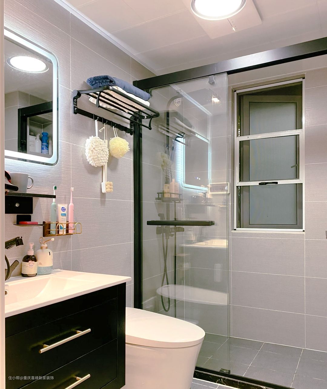 黑色的浴室柜在灰色系的卫生间特别打眼,同时也打破了卫生间的沉闷感和单一性。墙壁上也增加了置物架,用于毛巾、洗漱用品的放置,增强实用性。