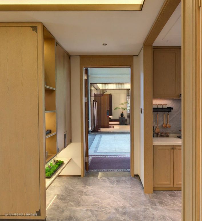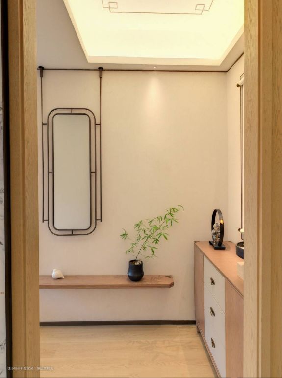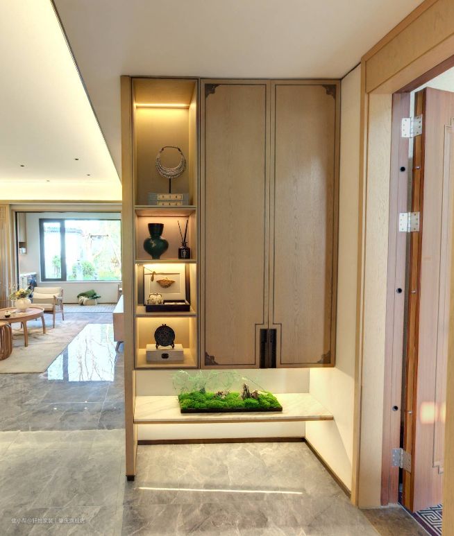 本案玄关在进门的右侧打造了一个新中式风的玄关柜,造型简约,博古通今,呈现出古典优雅的艺术韵味和现代简约的美感来。 悬浮的原木色玄关柜由展示柜+收纳柜组合而成,增加空间的储物量,收纳柜掩门边角的祥云设计,把传统文化掺入现代设计元素,以简练流畅的线条勾勒出一个素雅宁静的玄关空间。