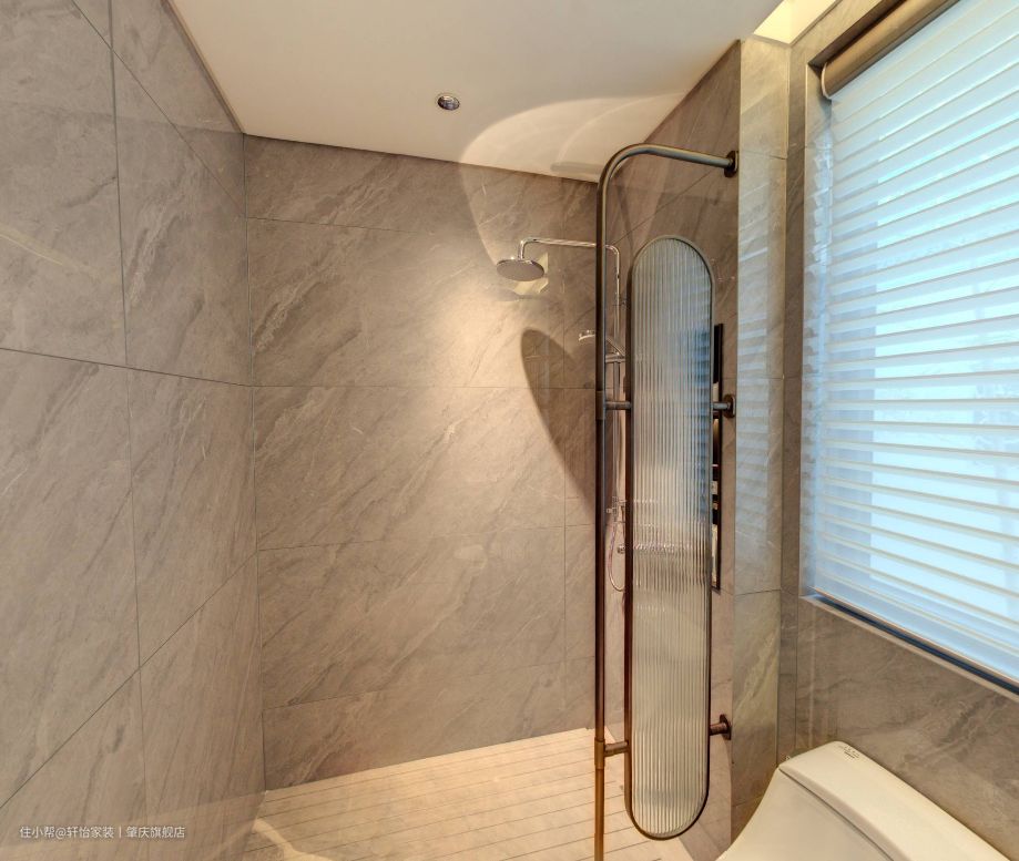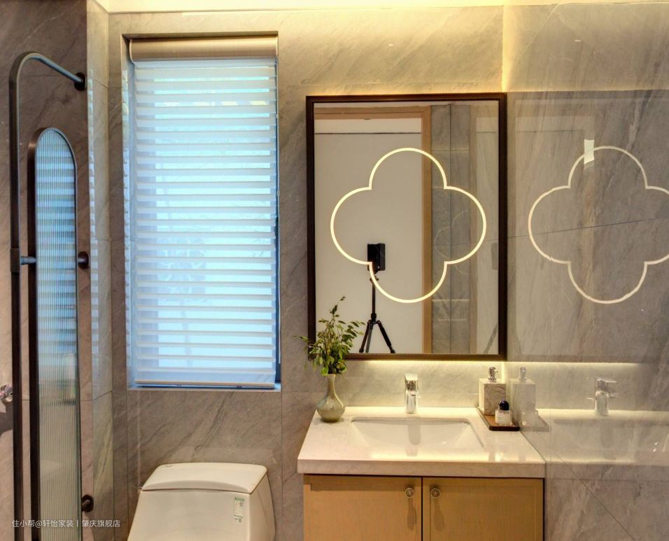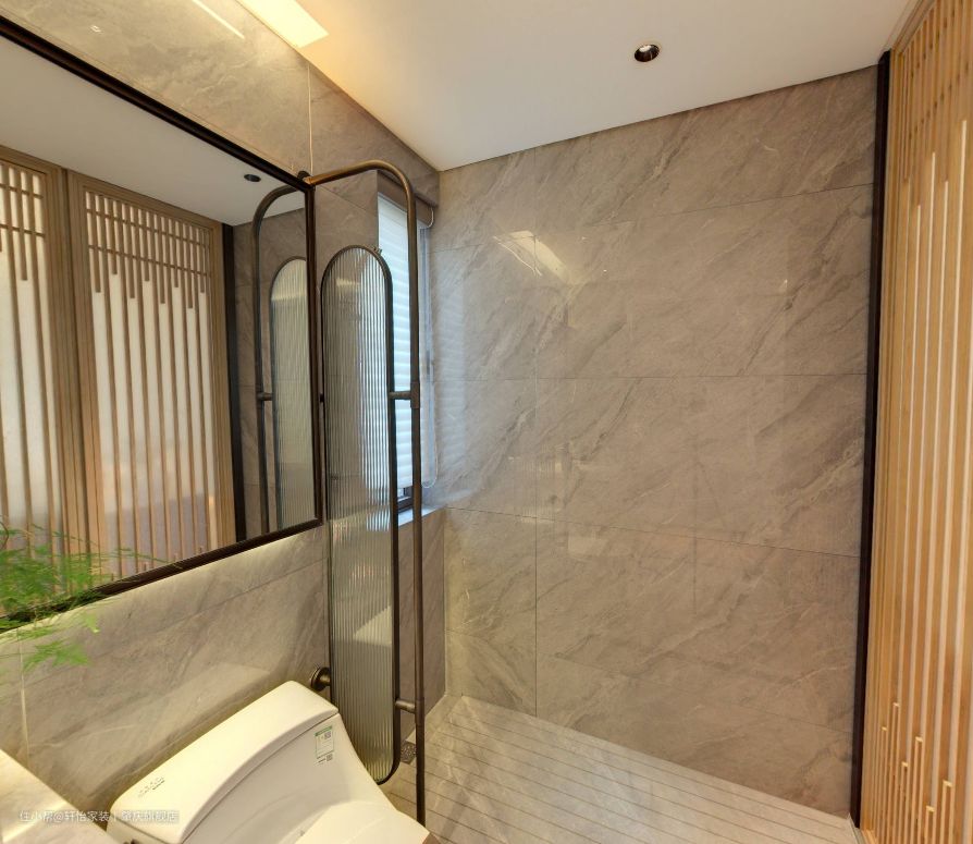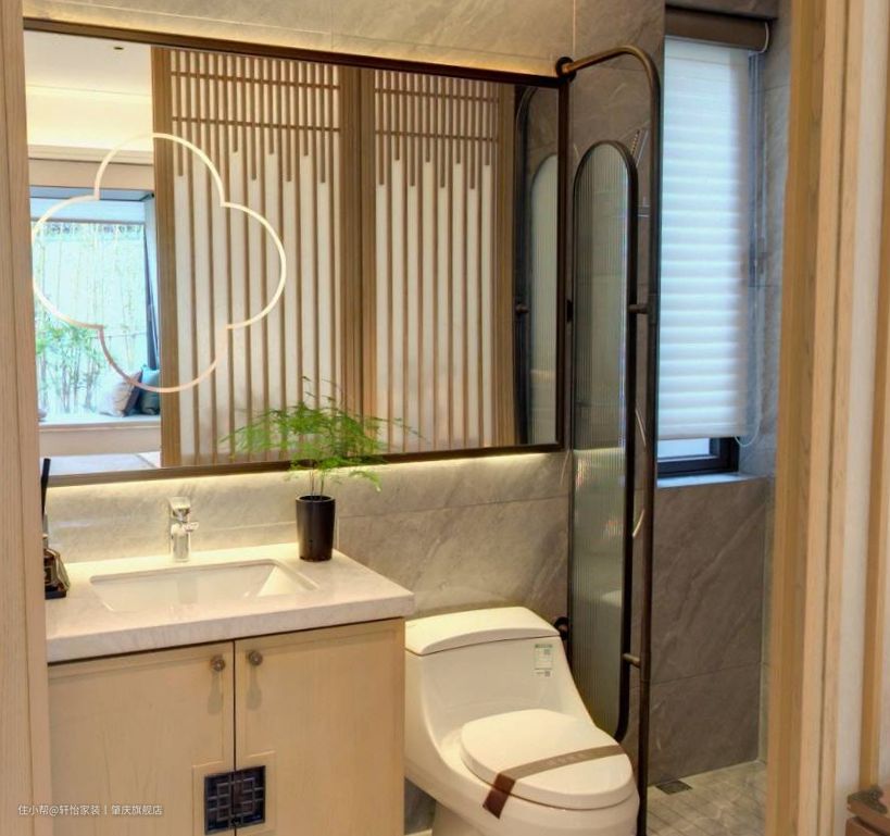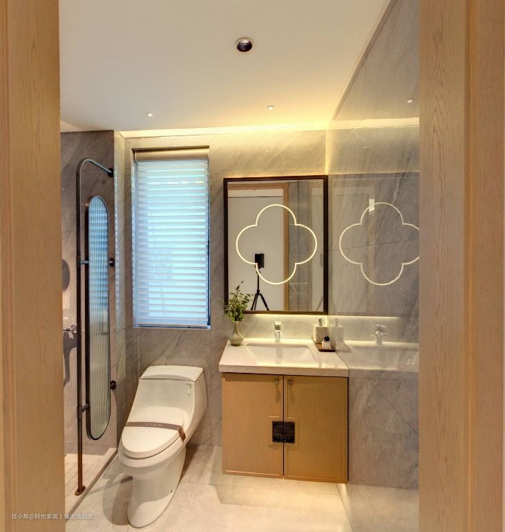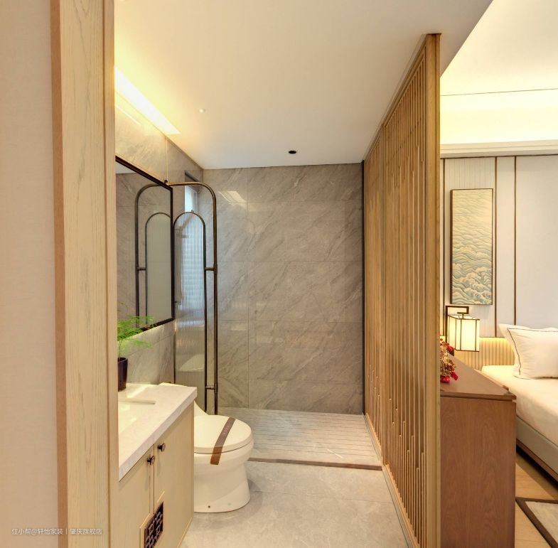 客卫做一体式的卫生间布局,把淋浴区、马桶区、洗漱区合在同一空间里,充分利用了空间,同时经济预算也相对降低。 悬浮的浴室柜设计,底部留空容易清洁,不会留有卫生死角滋生细菌,同时洗手盆和主卫一样做了台下盆设计,同样这样减轻业主的日常清洁工作,保持空间的整洁性。镜子上的中式元素灯带设计,不但增加空间的亮点,还增加空间的照明,方便业主的使用。 洗浴区同样用长虹玻璃做阻隔,既保持空间的采光和通风,又避免洗浴区的水溅出来,弄得到处湿哒哒,减少安全老人小孩的滑到事故发生。